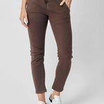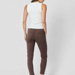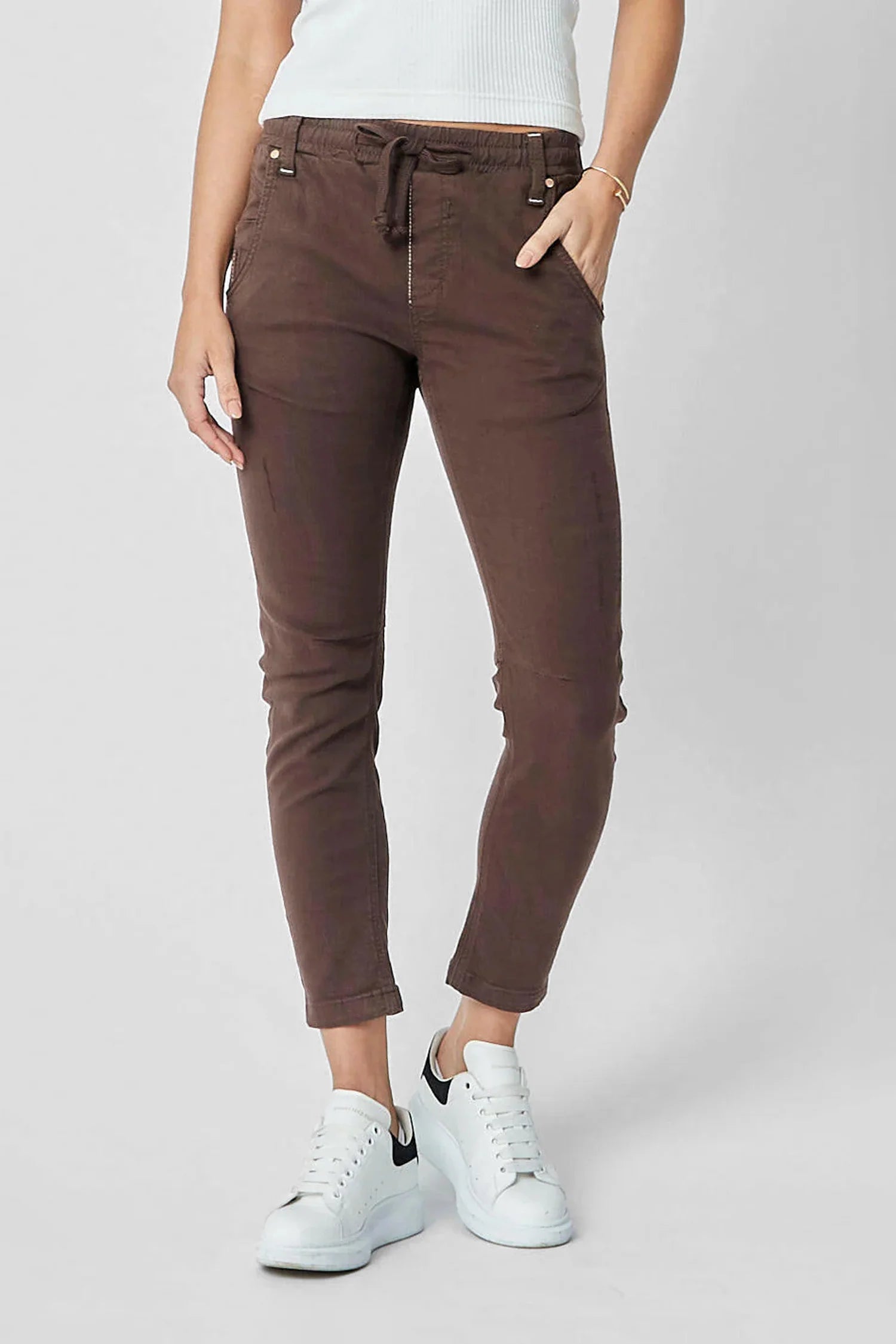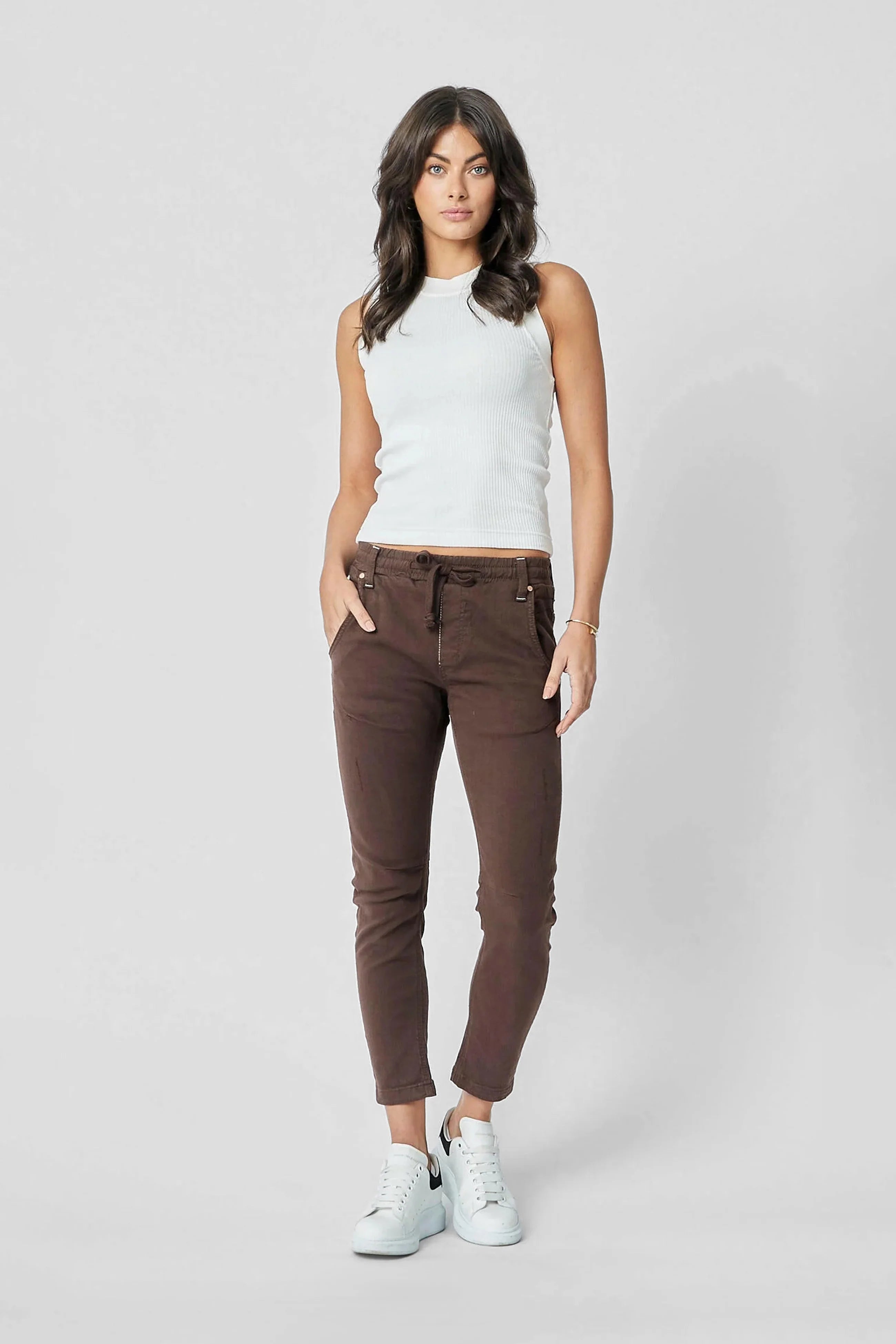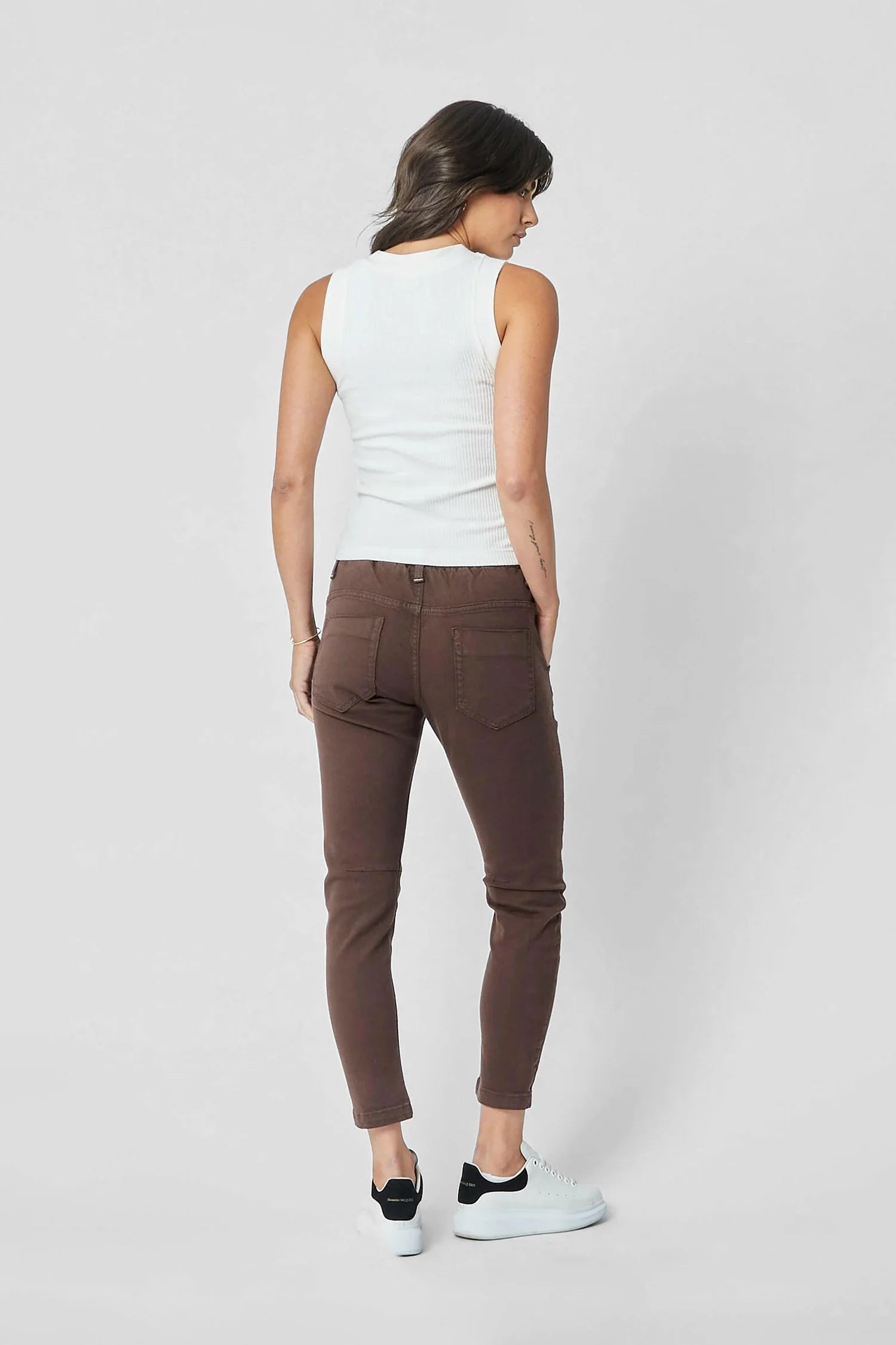 A mid-rise and cropped length in Seal Brown colour, complete with an elasticated waistband and sportive drawstring. These stretch denim jeans have a flattering arch shape leg which sits at the hip for a relaxed look.