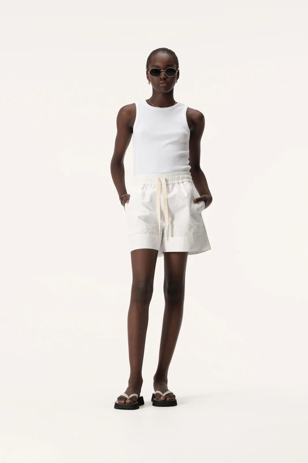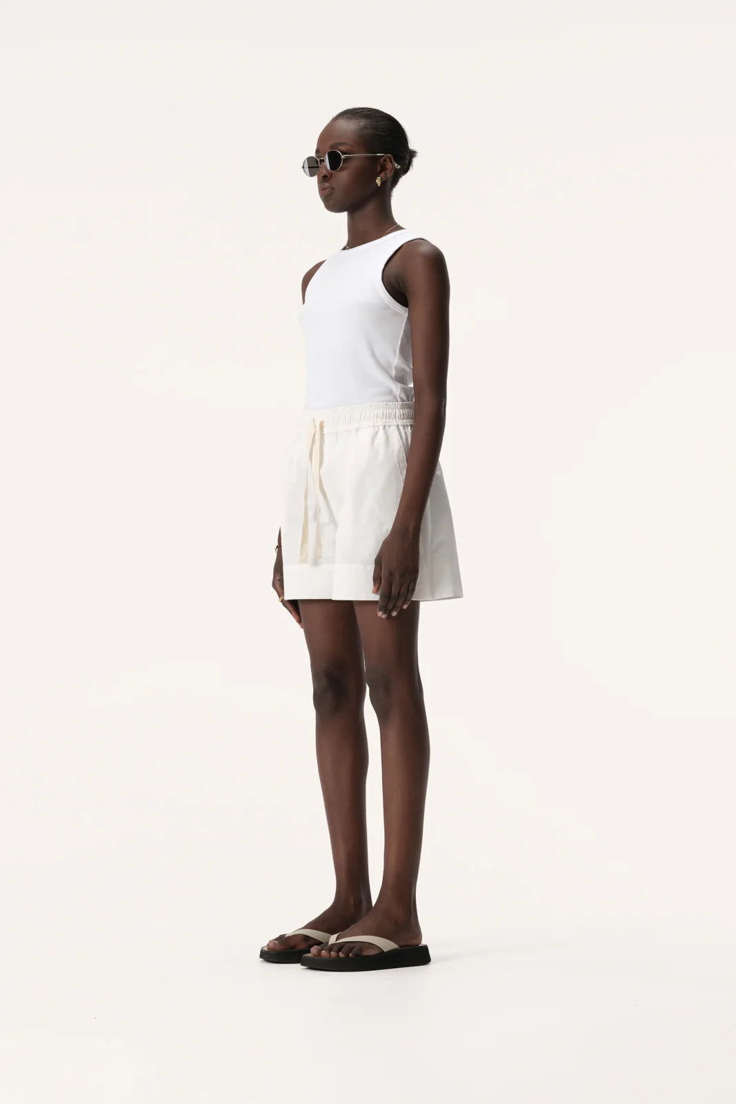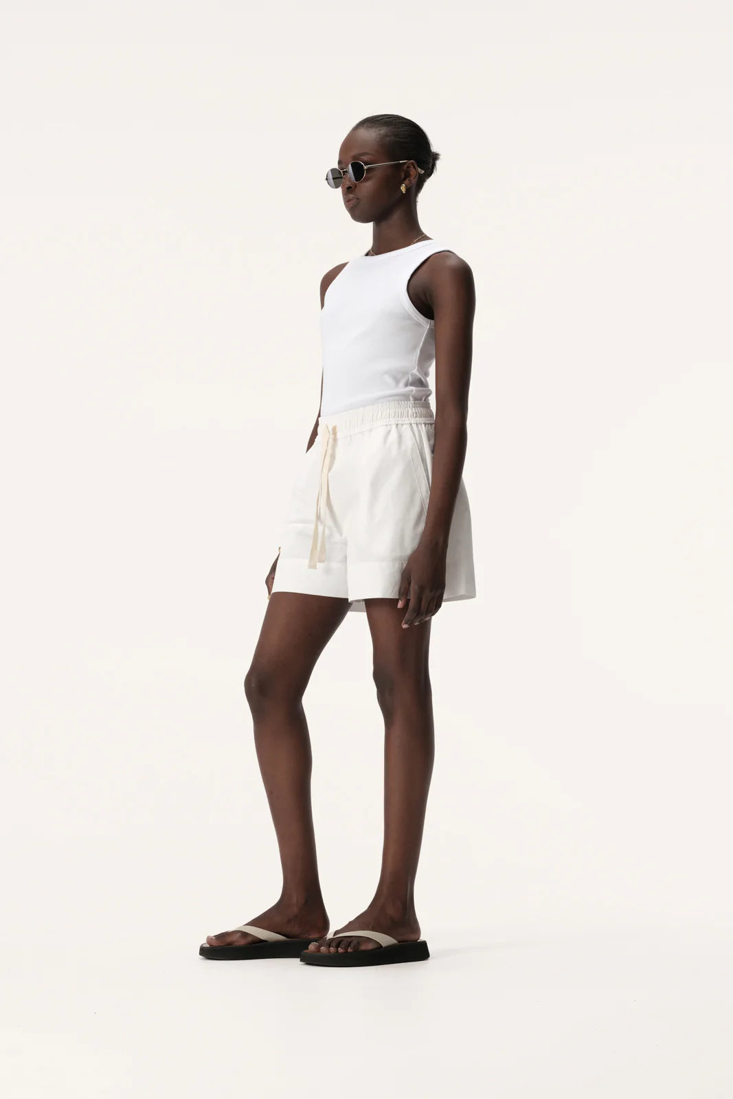 Light, cool, and effortless summer outfits are built upon the Clarke Short. A relaxed, comfortable cotton short ideal for a relaxed weekend at the beach, the Clarke Short has a wide leg with side pockets and an elasticated drawstring waist. Falling to mid-thigh, these shorts are the perfect swimwear cover-up, cafe coffee date, lazy walk on the main street style that pairs well with everything. The crisp white colour is timeless for endless wear year after year. Style with chunky slides and a basic tank top.