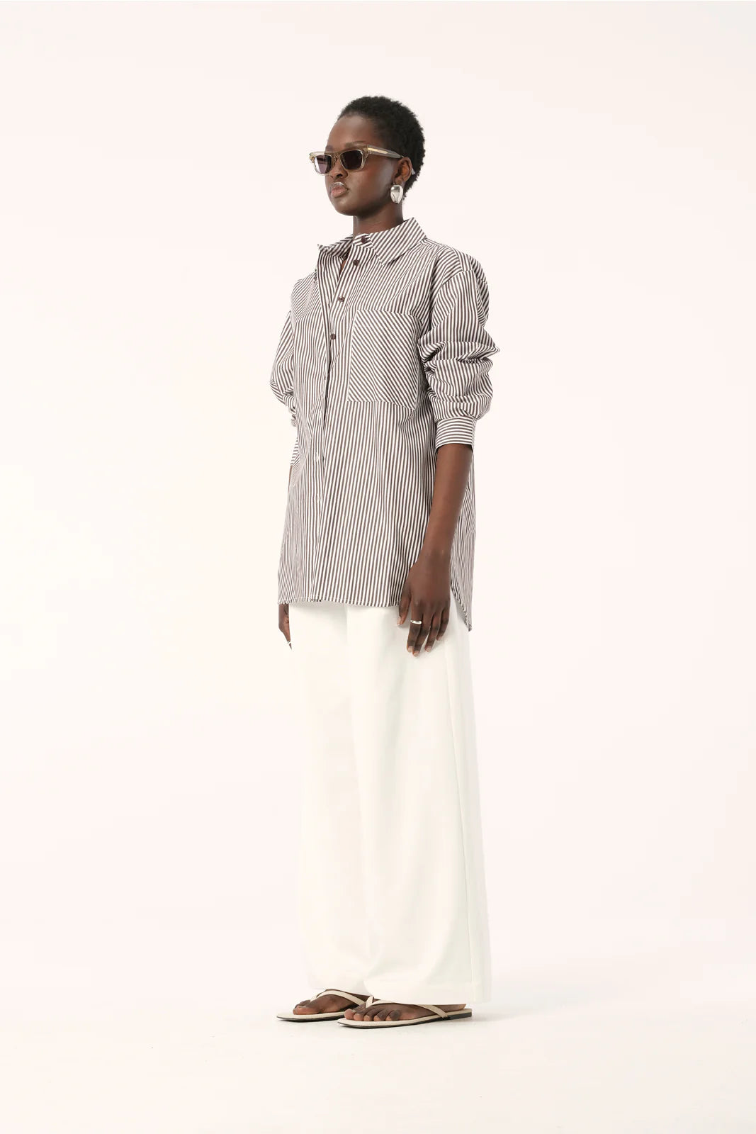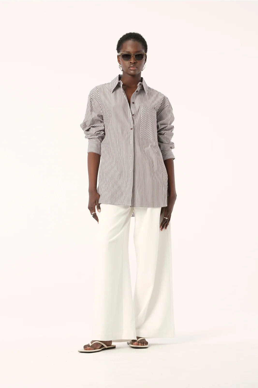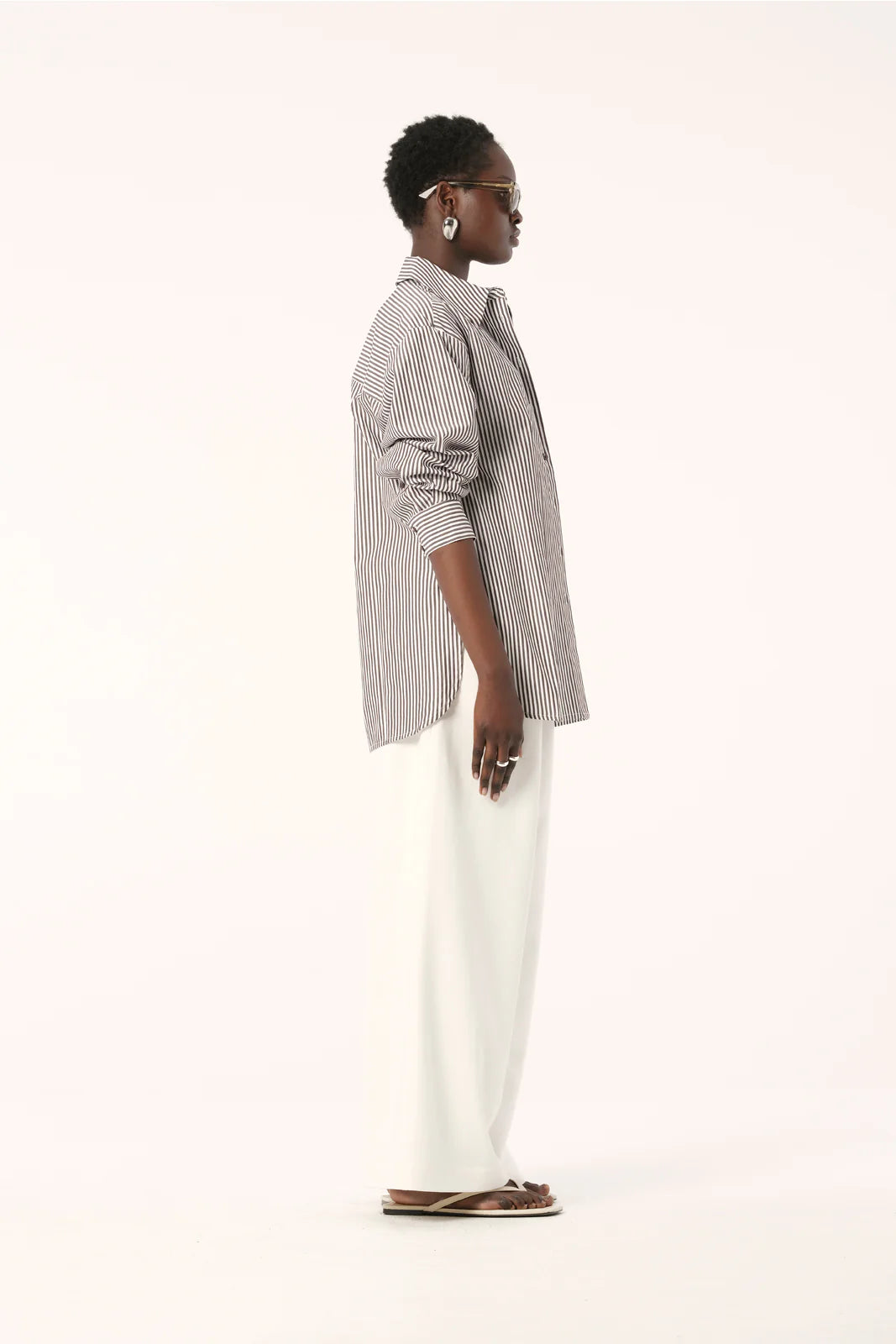 The Faye Shirt adds a warm hue to your wardrobe staples. The latest addition to our everyday shirting range, the Faye Shirt is made from 100% natural cotton and features a classic stripe pattern in a warm chocolate brown against a neutral white base. Cut to a relaxed, slightly oversized silhouette, the Faye Shirt is suitable for layering over basics with denim essentials or styling with crisp tailored pieces for a look that combines masculine design with feminine sensibilities.