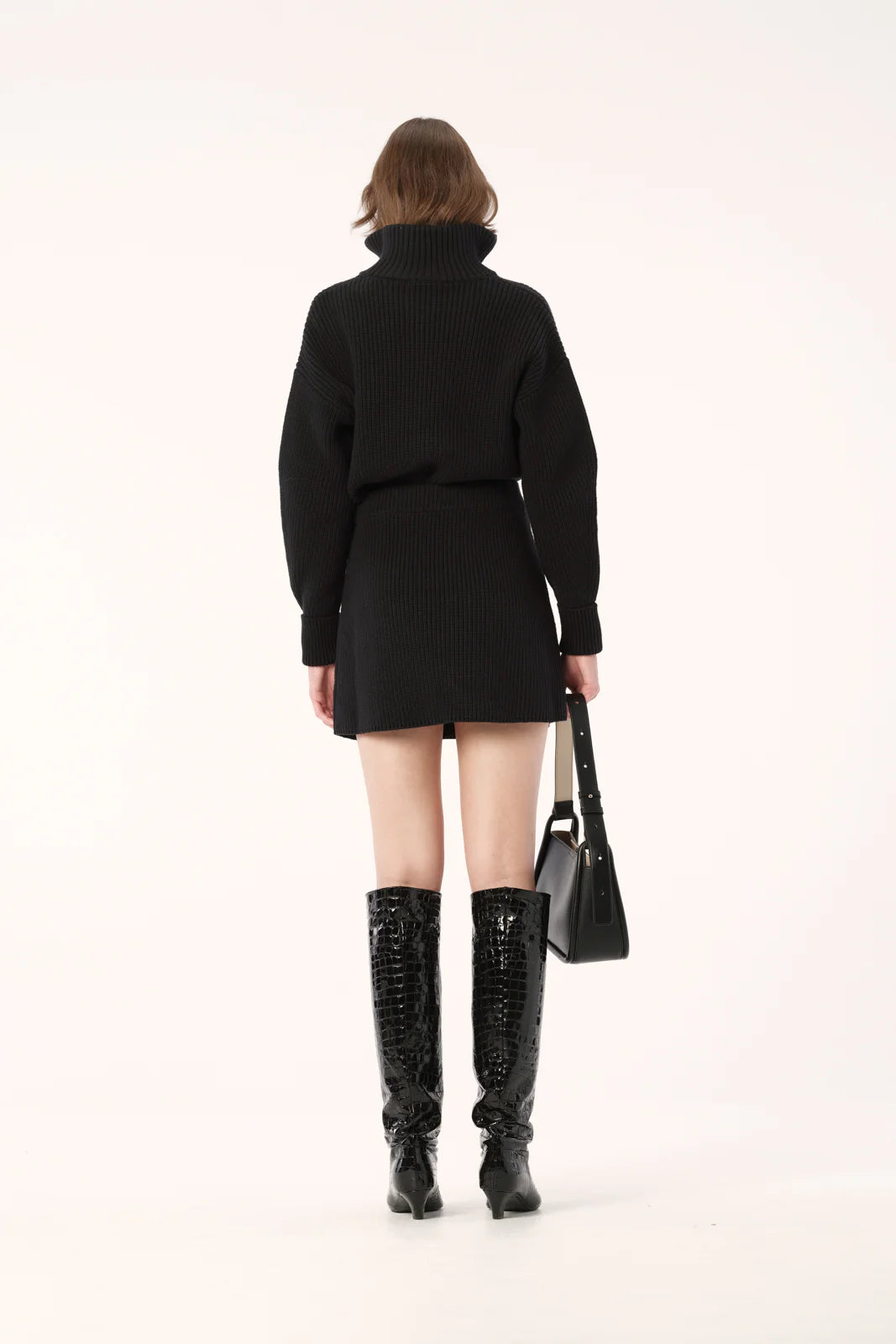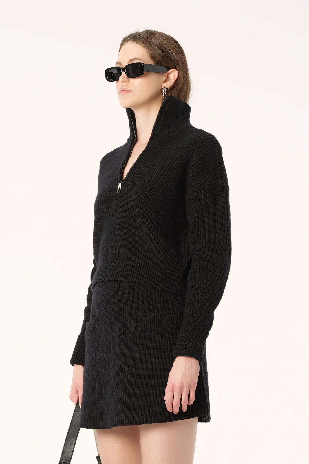 This season’s go-to style for elevated casual outfitting, the Franca Knit is a preppy inspired half-zip top made of 100% cotton. A past-season favourite style now in a classic black, the Franca Knit is constructed using a thick, chunky knit, giving the top a heavyweight feel that keeps you warm in the chill. Cut to a boxy, relaxed fit, the Franca Knit features a high neckline, front quarter zip, and full length sleeve with fold-back cuff. Match with the Franca Skirt and on-trend tall boots for a simple and elegant day to night look this winter.