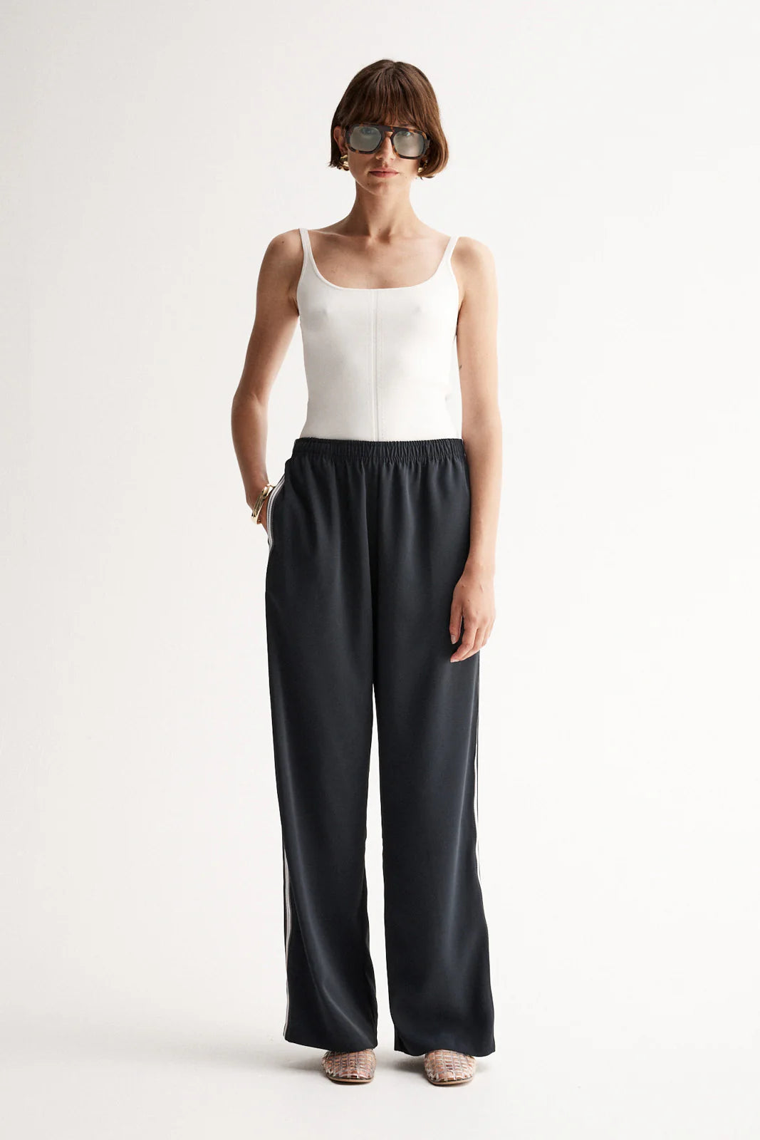 The Madison Pant in Midnight Navy by Elka Collective is a loose fitting pant for all-day comfort. Made of a polyester fabric, the Madison Pant is cut to a mid rise with an elastic waistband and full length straight leg. A sleek and refined silhouette for work to weekend wear.