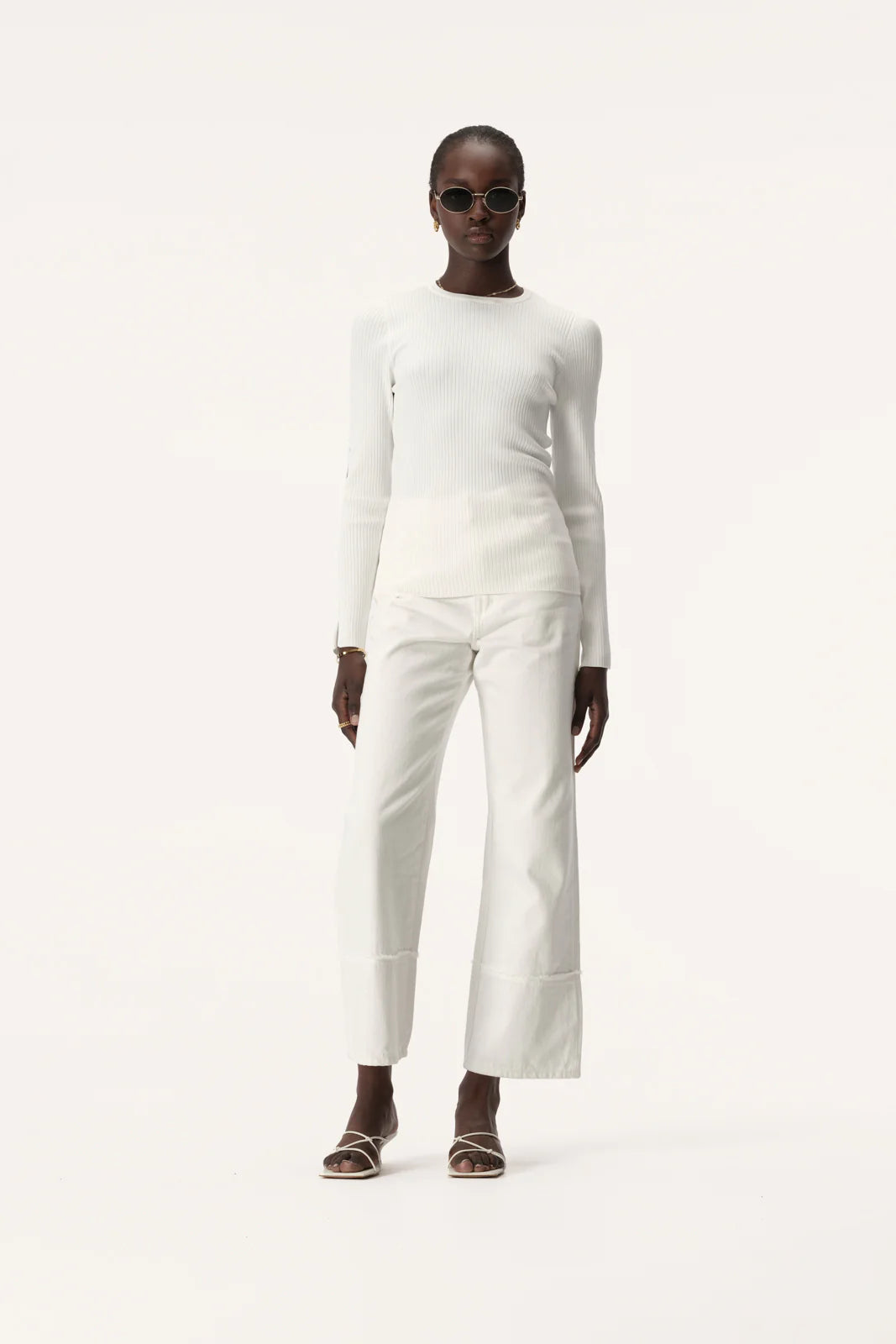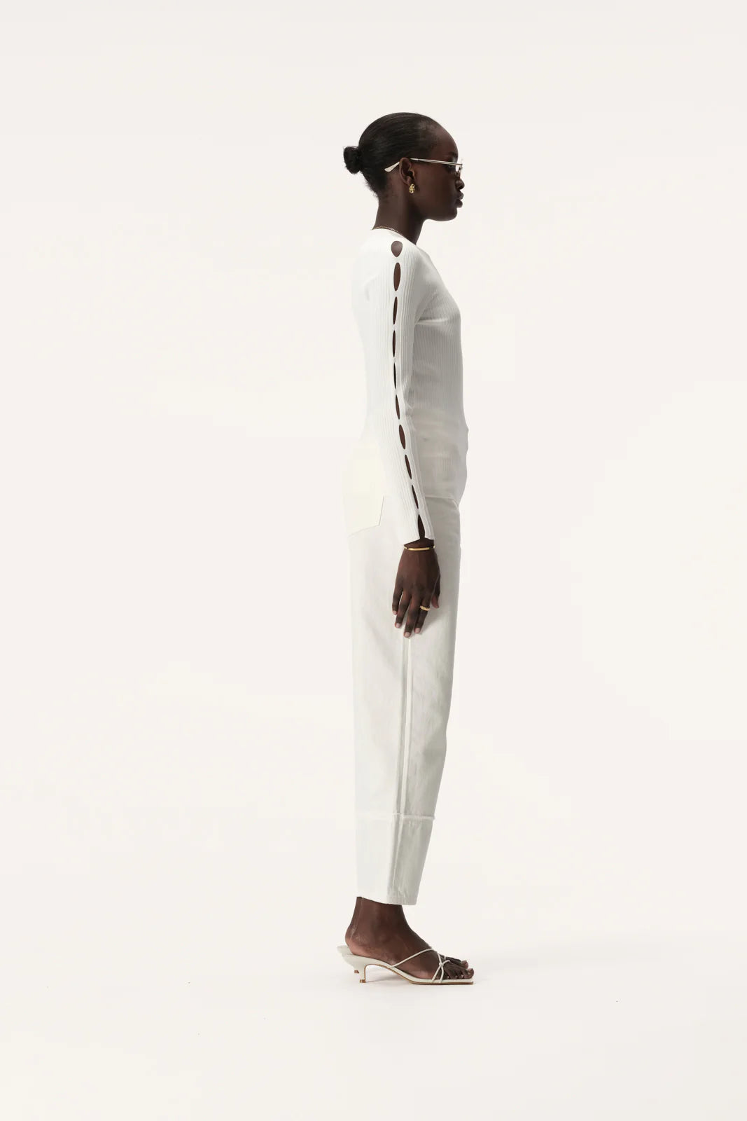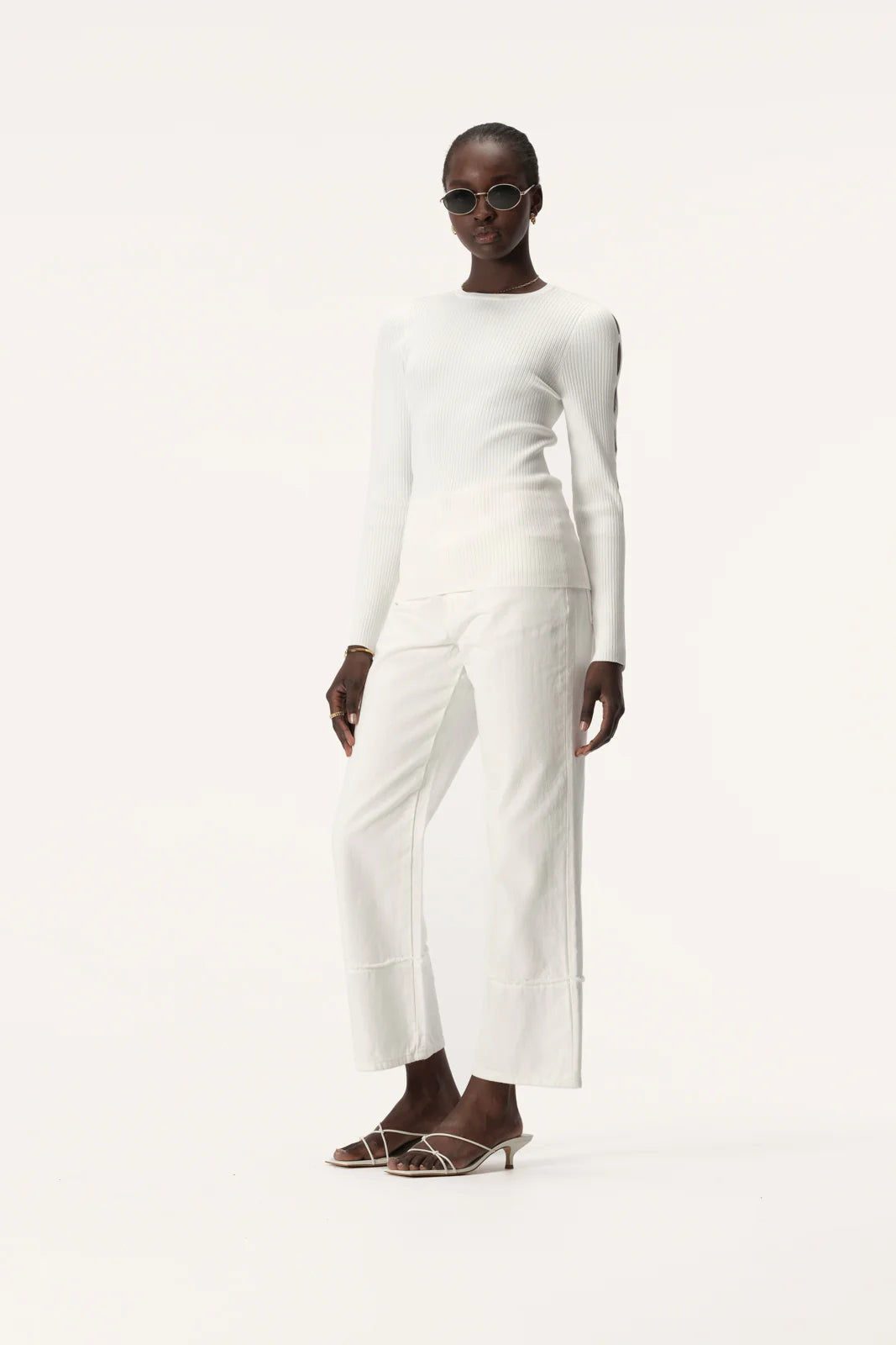 Simple pieces that emphasise wearability make up the core of Elka Collective knitwear styles. The Nadia Knit Top in white embodies this flawlessly, with its classic rib knit fabrication, crew neckline and long sleeves with cut out feature from shoulder to wrist. Made of a viscose-nylon blend, this top has a soft feel and slim fit with ample stretch for comfort. Layer with staple denim styles or pieces from our modern tailoring collection.