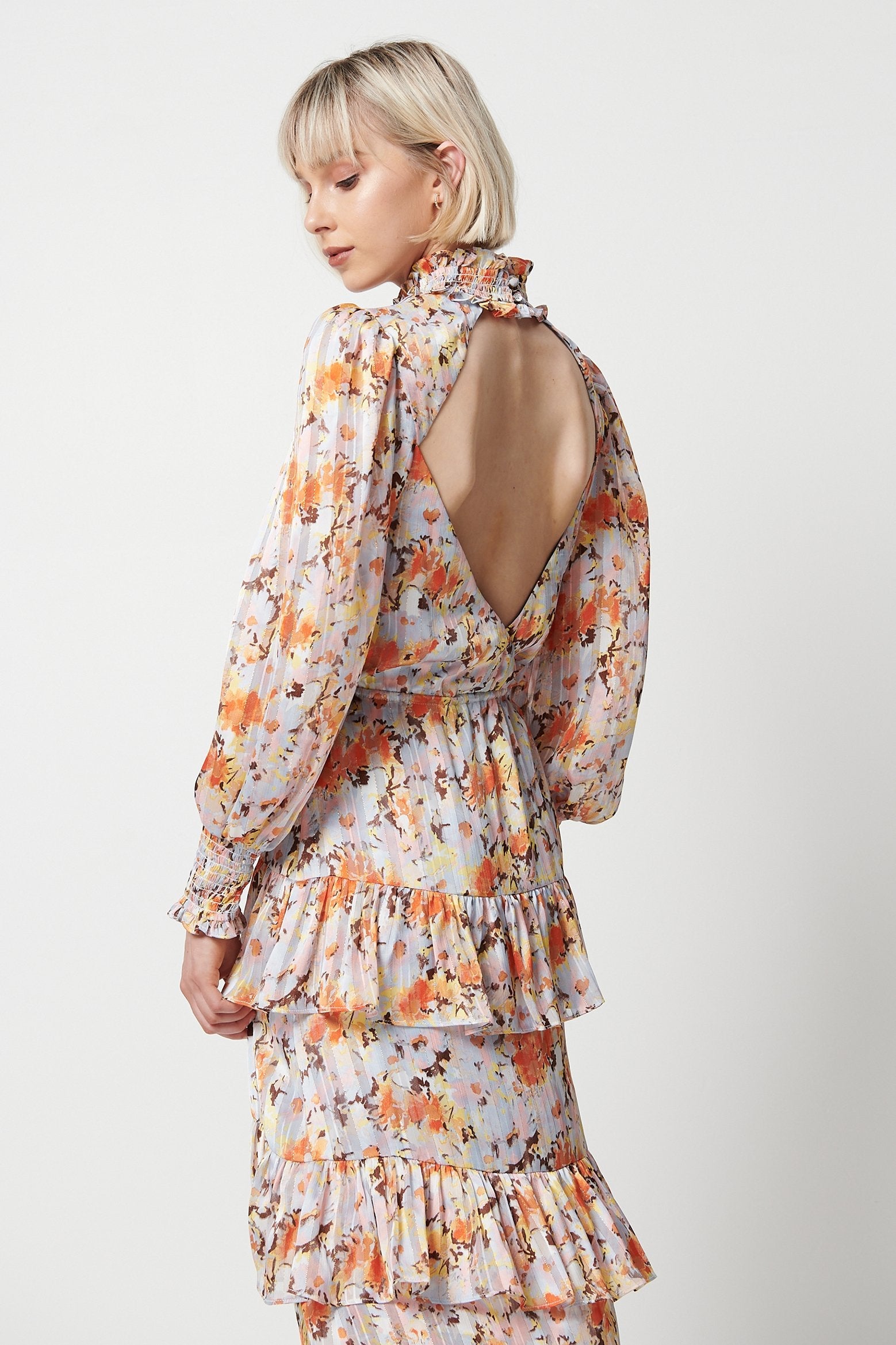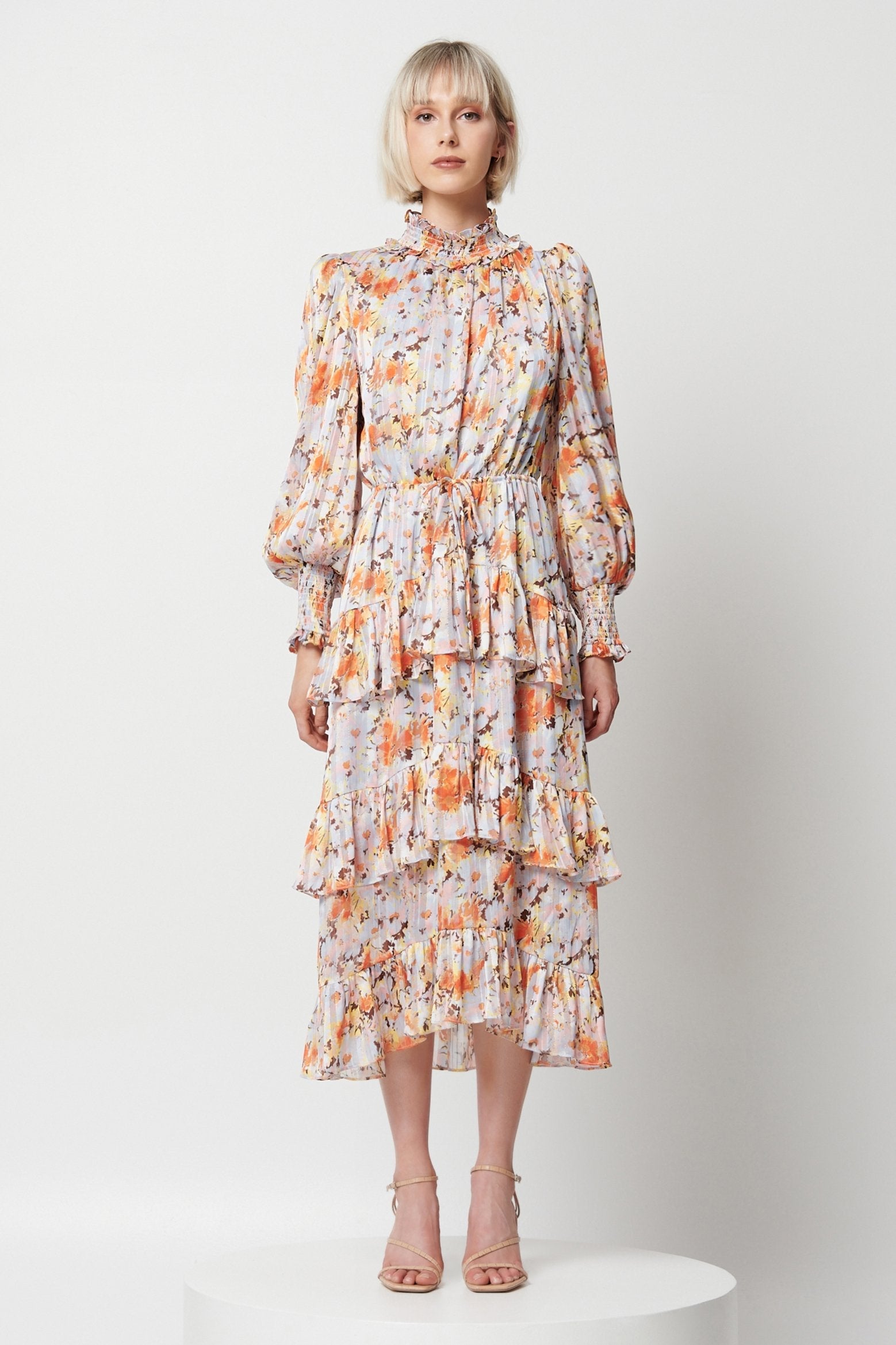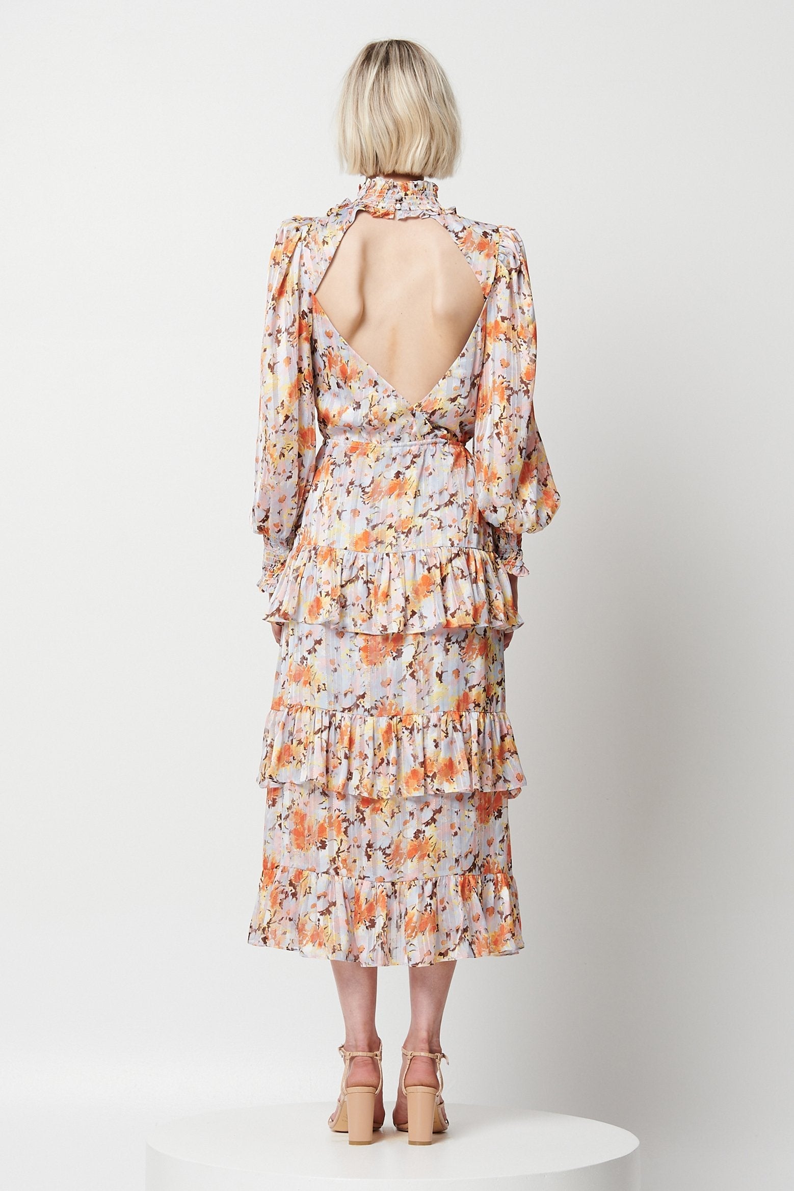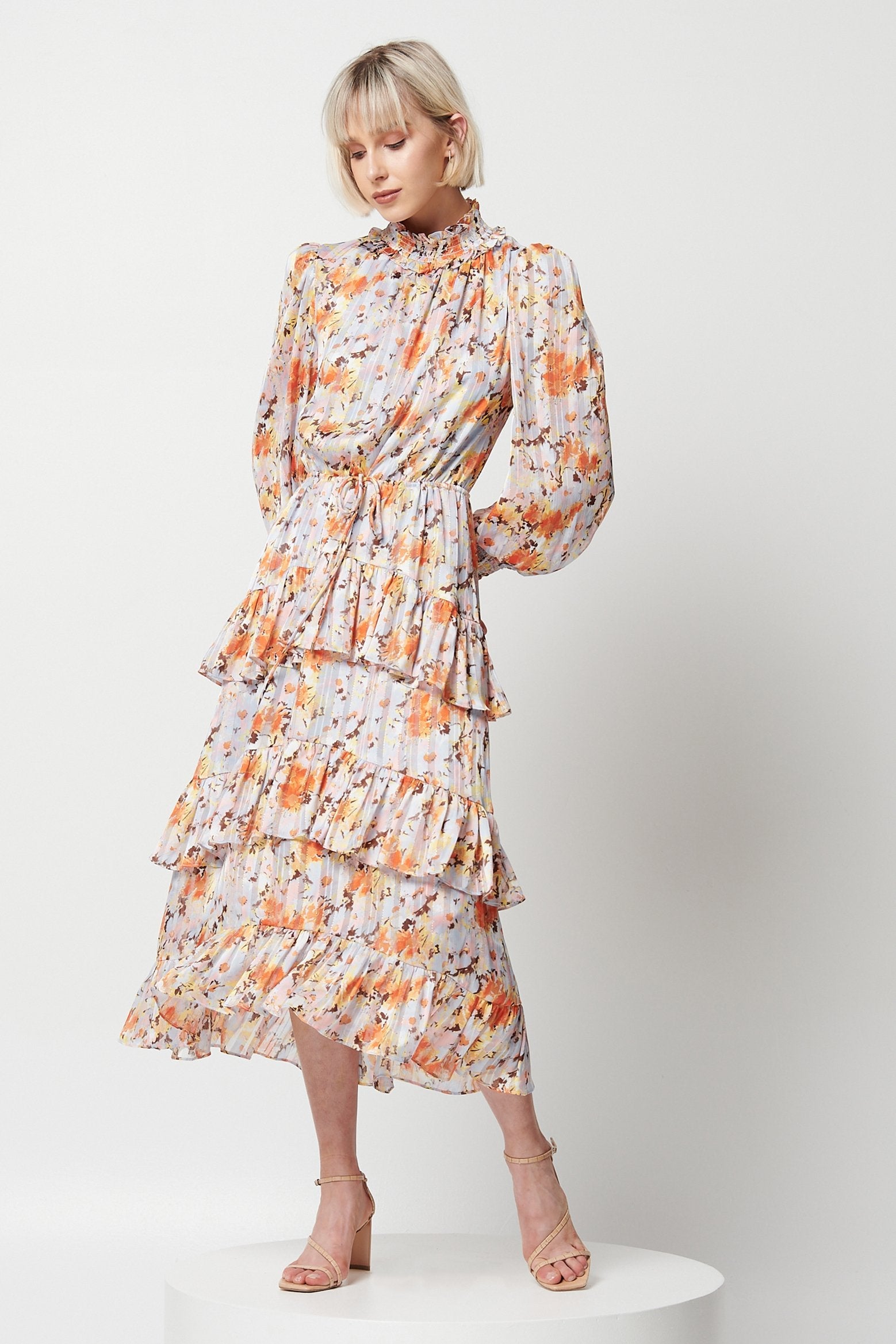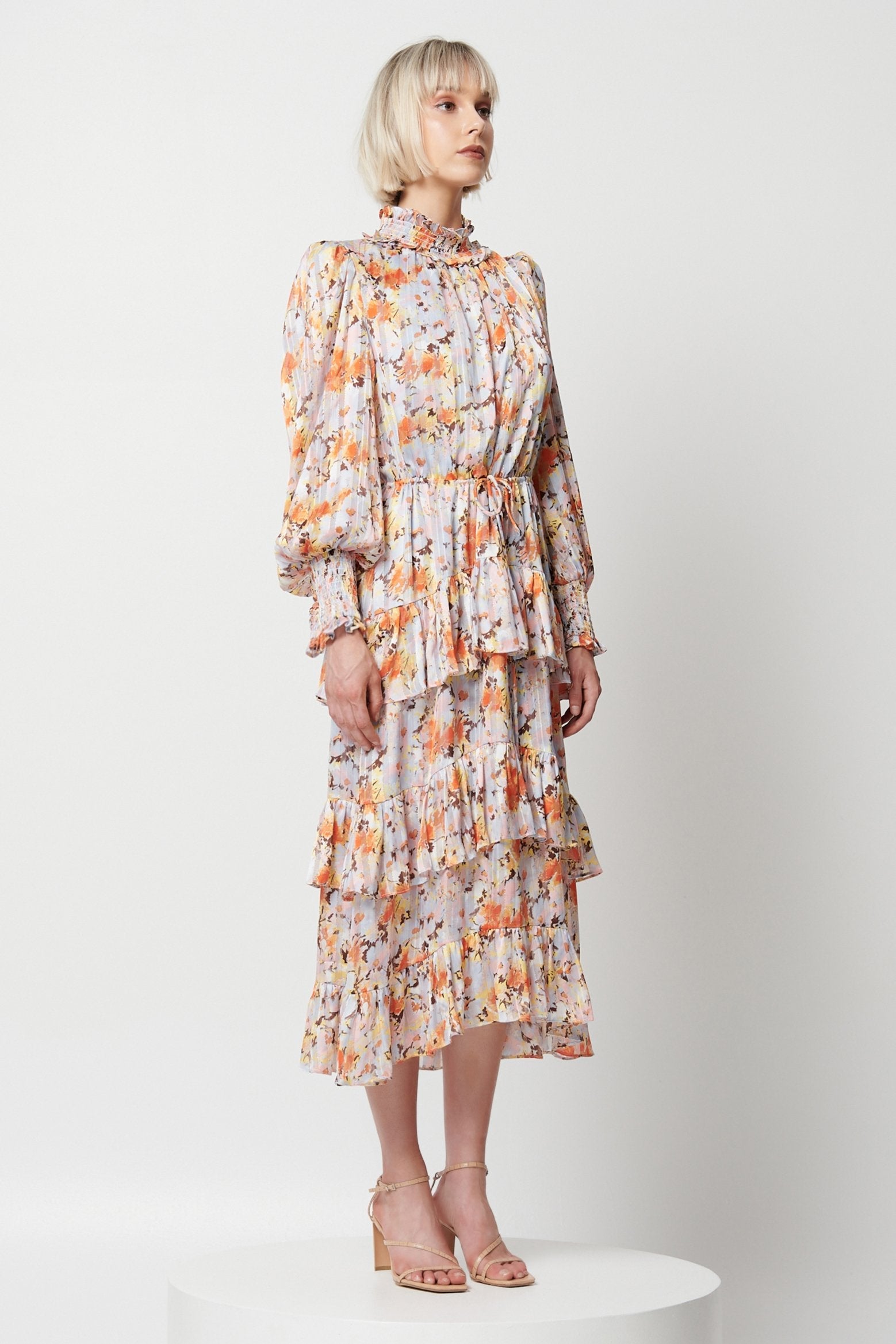 Embrace effortless elegance in the Caseria Dress by ELLIATT. Midi in length, this dress features a high neckline, full-length blouson sleeves and a triple tiered skirt with ruffle detailing.