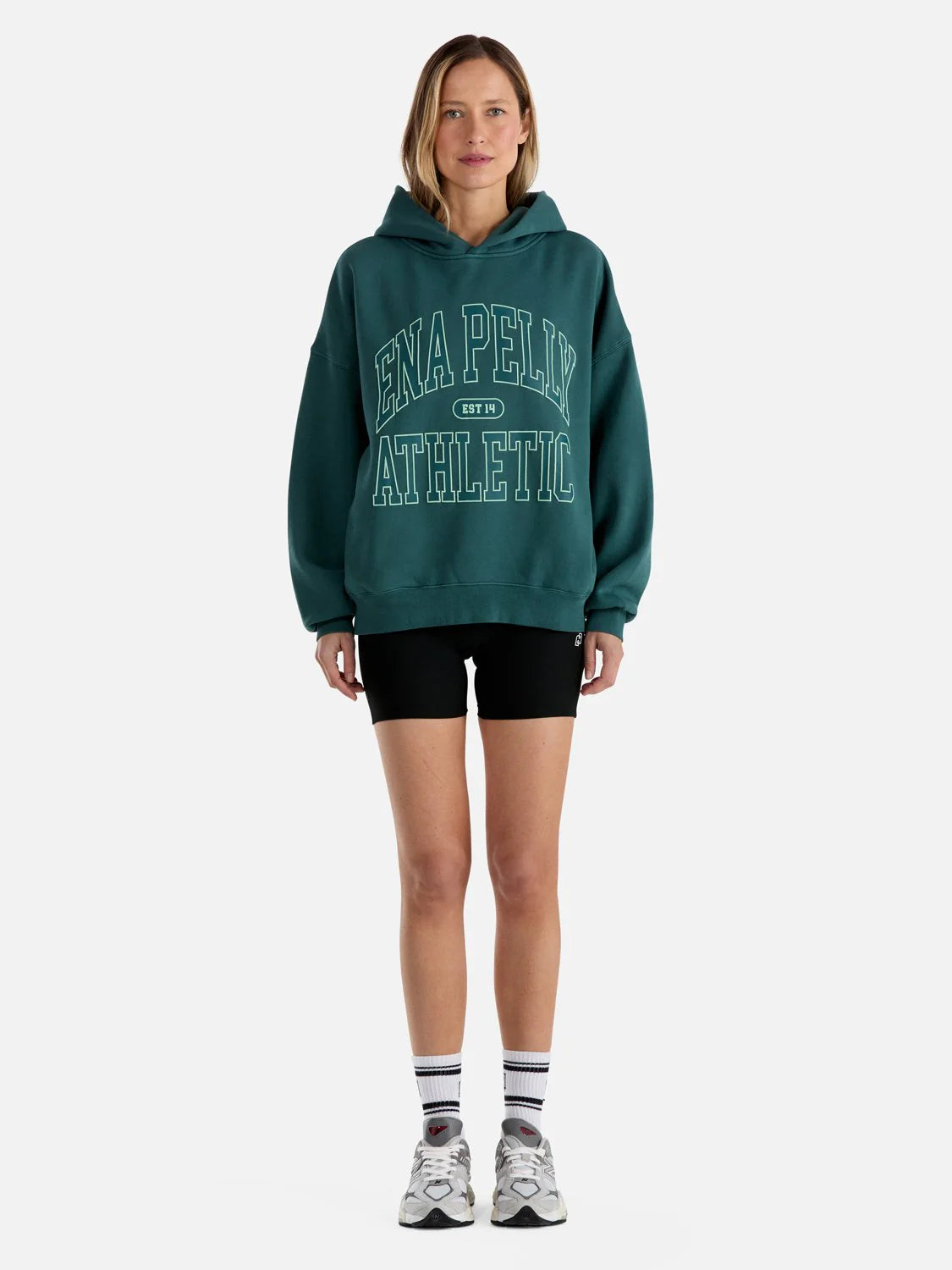 The Athletic Hoodie is designed in ENA PELLY's best-selling and customer-favourite hoodie shape. It has a relaxed fit and is true to size. Crafted from super-soft fleece and showcasing a collegiate print in tonal puff print in this seasons must-have Rich Jade colourway.