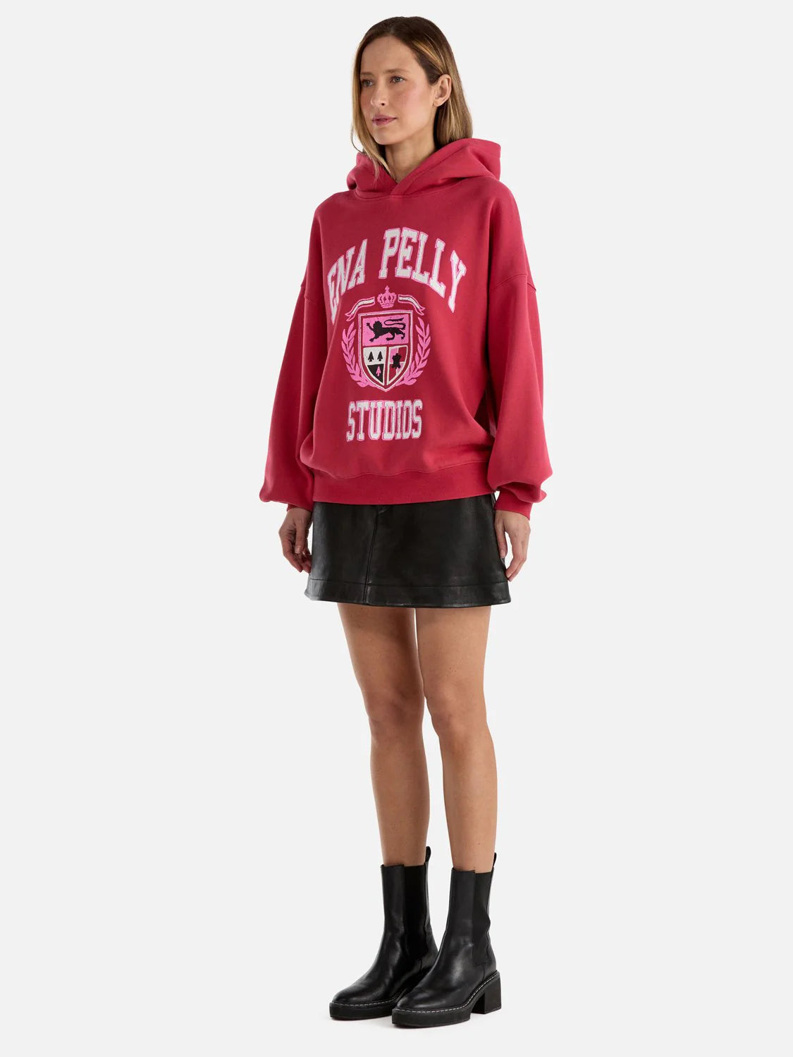 The Brooke Oversized Hoodie is crafted from a thick, plush fleece fabrication in a washed poppy red colour featuring a collegaite inspired crackeled print. This style is designed to be oversized through the body with a relaxed, neat fit at the hem.
