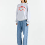 The collegiate sweatshirt is made from cotton terry with a garment-washed finish for a unique texture. Its oversized fit, crew neck, and ribbed trims make it ideal for everyday wear.
