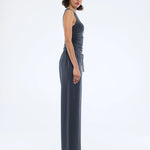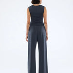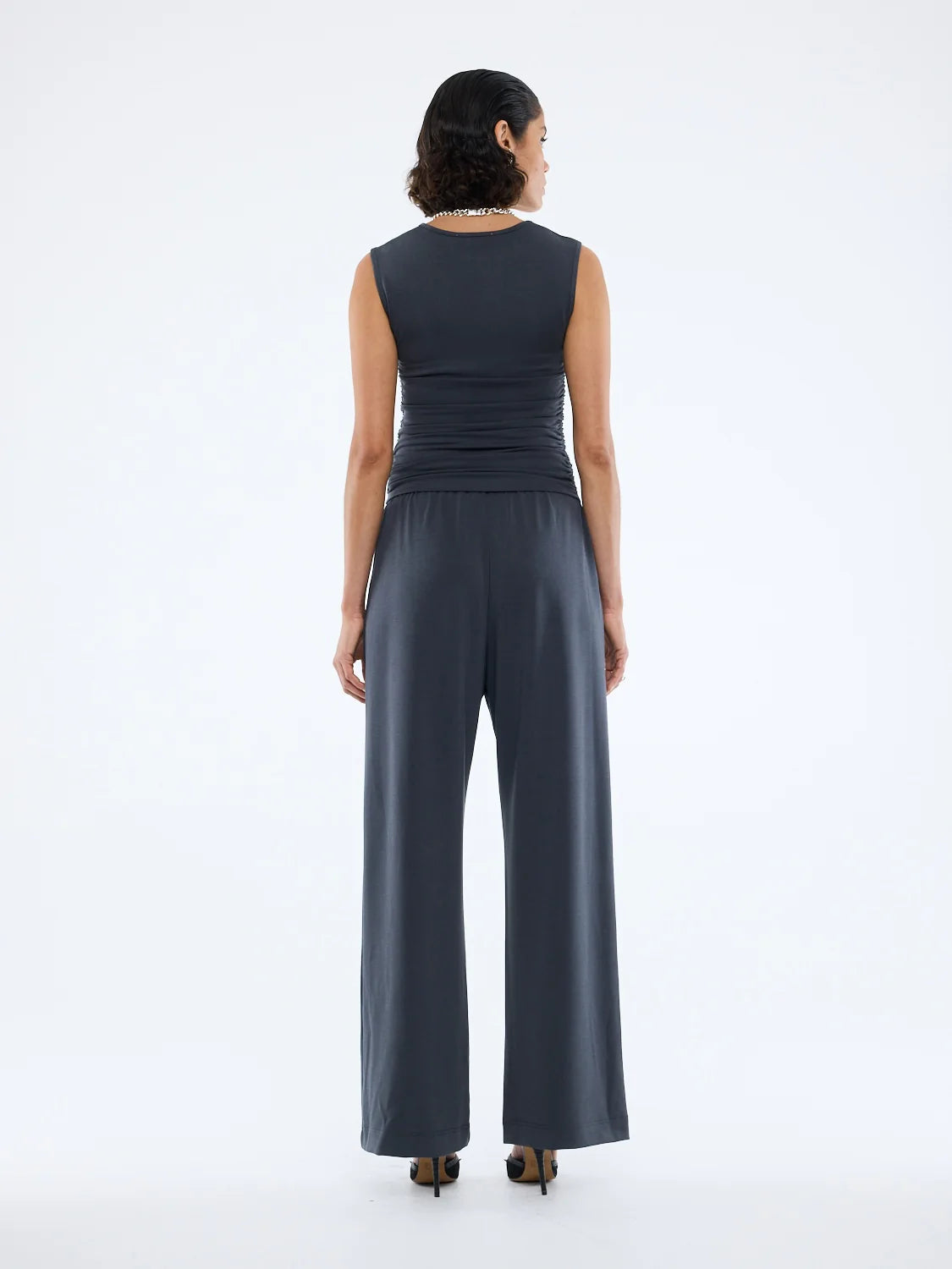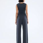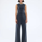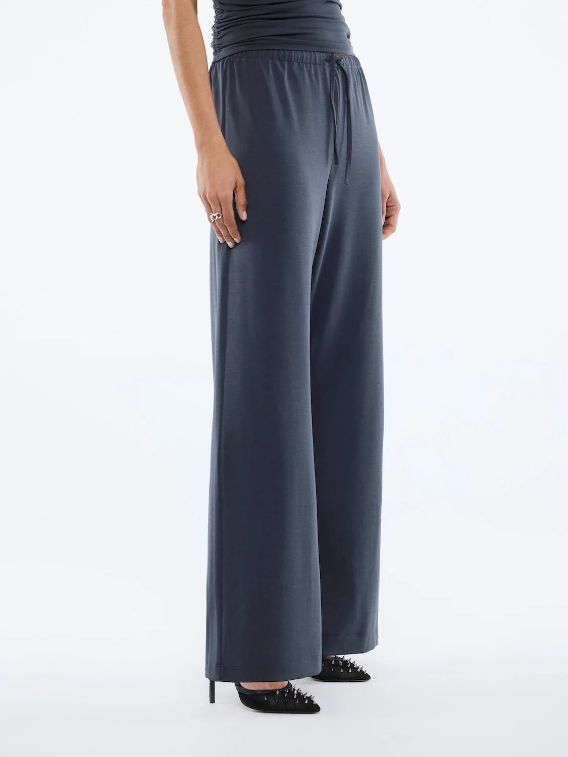 The Nella Soft Jersey Pant in Vintage Black is cut mid-waist in a relaxed, wide-leg silhouette.