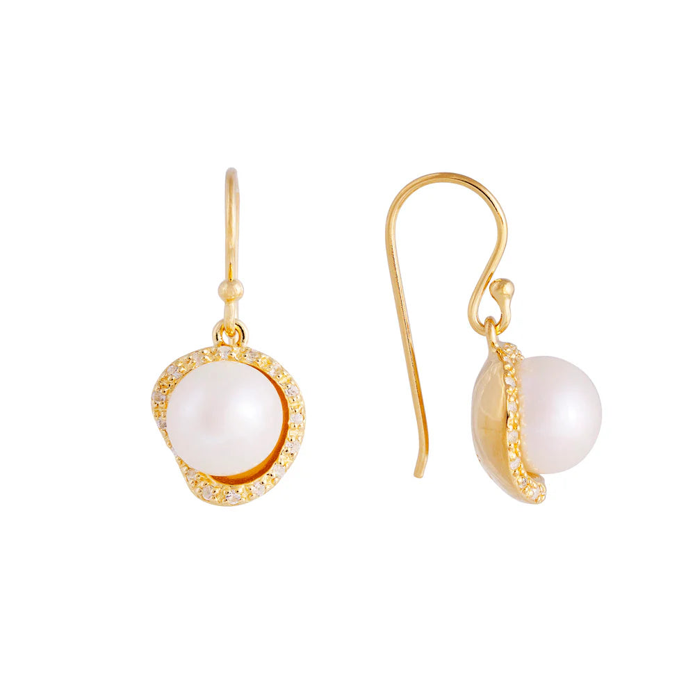 Add a refined touch of sparkle with the Freshwater Crystal Hooks. Featuring radiant freshwater pearls set inside a polished gold dish encrusted in shimmering crystals, these earrings strike the perfect balance between classic elegance and contemporary flair. Set on delicate sterling silver hooks, they’re lightweight, comfortable, and designed to catch the light with every movement.