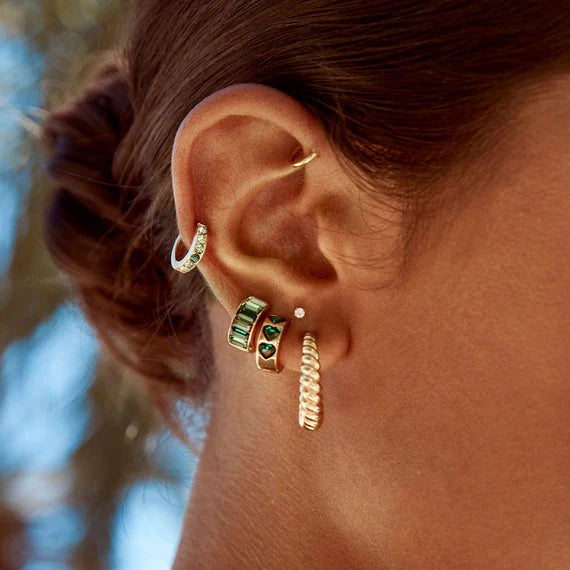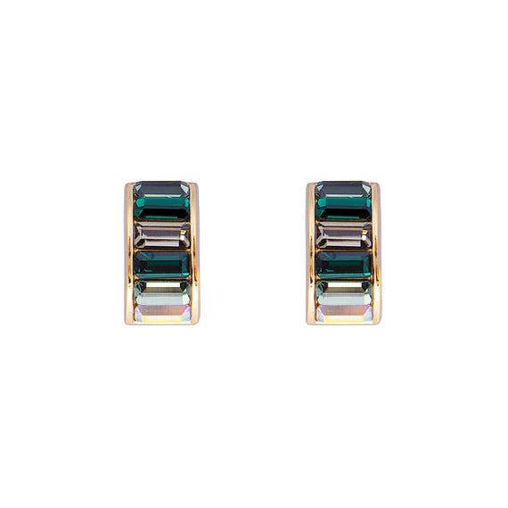 These simply stunning huggies comprise green baguette crystals in ombre design set in recycled sterling silver 18k gold plate. An elegant everyday extremely light weight huggie that will add a pop of colour to your outfit.