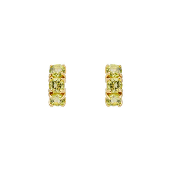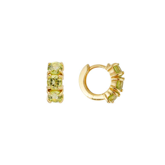 Known as “the Evening Emerald” because of its sparkling green hue, peridot looks good any time of day. These gemstone huggies feature 3 round faceted peridot stones that will illuminate your face.