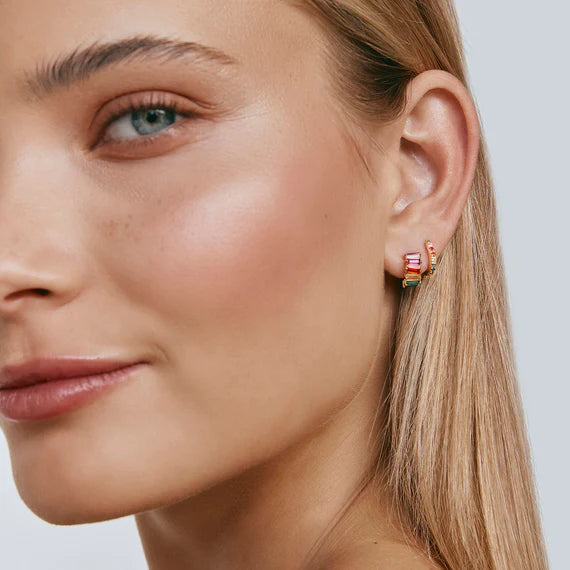 Add a splash of colour to your life, with these eye-catching sterling silver 18k gold plate huggies encrusted in a rainbow of baguette Swarovski crystals.