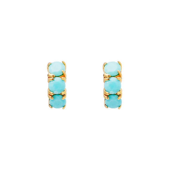 Huggies continue to skyrocket in popularity. These gemstone huggies feature 3 round faceted turquoise stones that will illuminate your face.