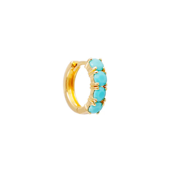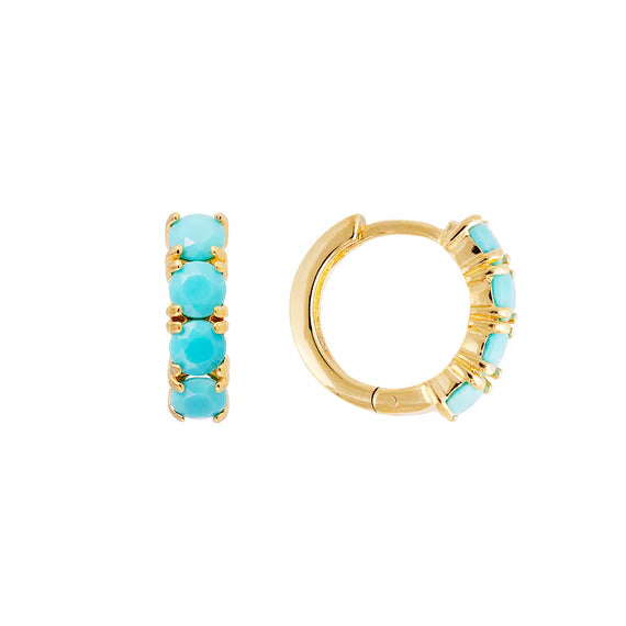 Huggies continue to skyrocket in popularity. These mid-sized gemstone huggie hoops feature 3 round faceted turquoise stones that will illuminate your face.