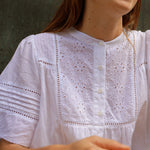 With a delicate design, this cotton voile blouse features short, slightly puffed sleeves and a half-placket buttoned closure. Floral embroidery, made with pintucks and ladder lace details, adds a handcrafted touch that enhances the garment. Its regular fit ensures comfort throughout the day, making it a perfect choice.