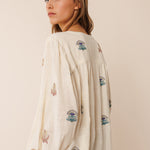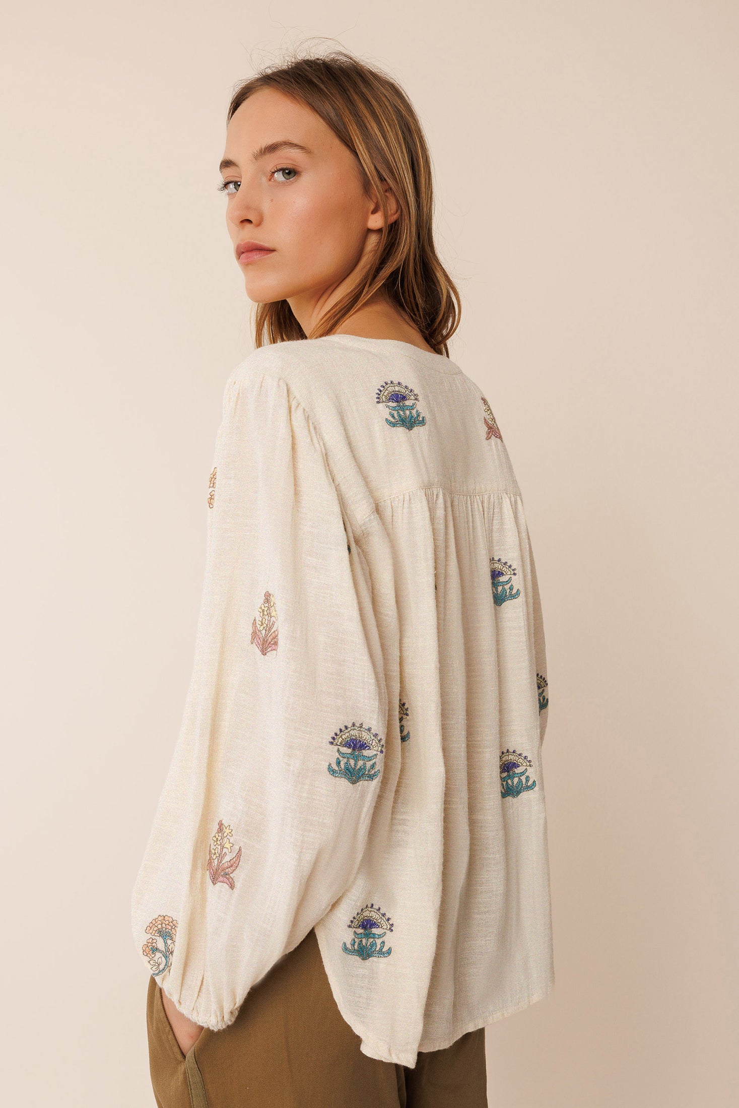 A shirt with a box collar and balloon sleeves is a must have. This also has floral embroidery on an organic cotton gauze and is super comfy.
