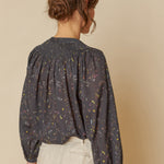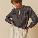 This raglan sleeve shirt is crafted in cotton voile with a floral print inspired by handmade paper. The smocked yoke detail adds texture and character to the garment. A relaxed fit makes it comfortable and elegant at the same time.