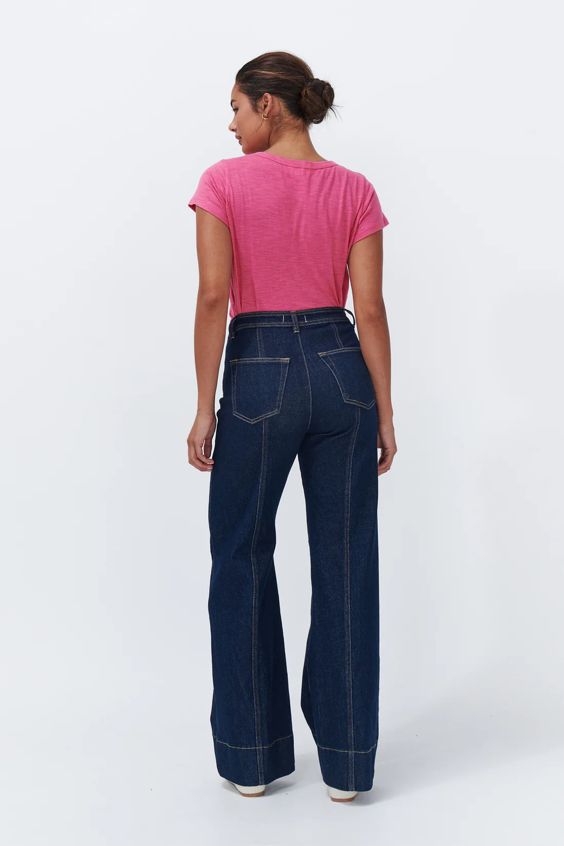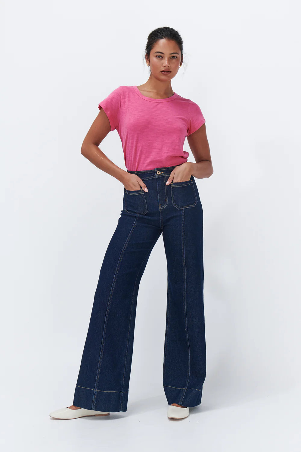 Cut with a flattering high rise waist and tapering out to a 70’s inspired wide leg. Featuring a longer leg length, patch pockets and a retro seam the Farrah is sure to inspire LA vibes.