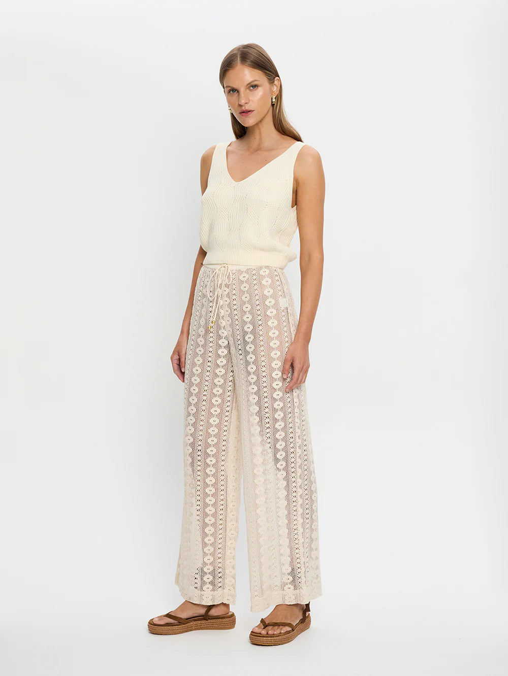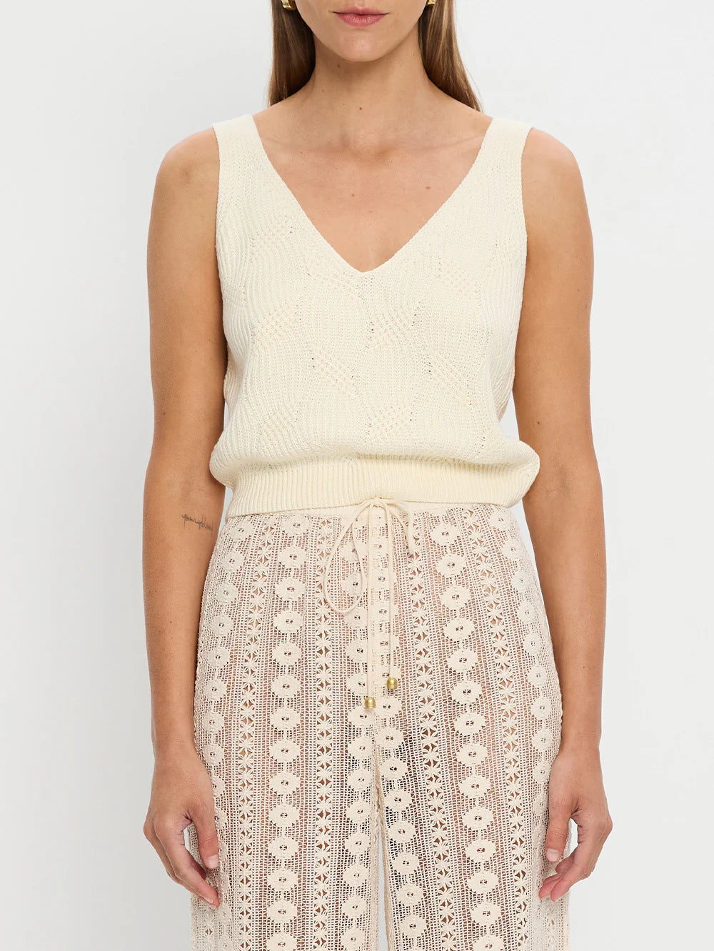 The Aloe Knit Cami in a cream hue features a v-neckline, wave stitch detailing throughout complete with a ribbed hem.