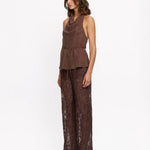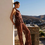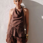The Arabella Halter Top features a high neckline with a softly draped cowl and a low open back, finished with a removable waist tie for optional shape. Fluid and elegant, it’s designed to move effortlessly from day to evening. Style with tailored pants or a flowing skirt for a refined look, or pair with denim for a relaxed yet elevated finish.