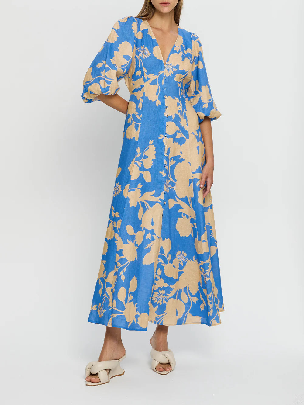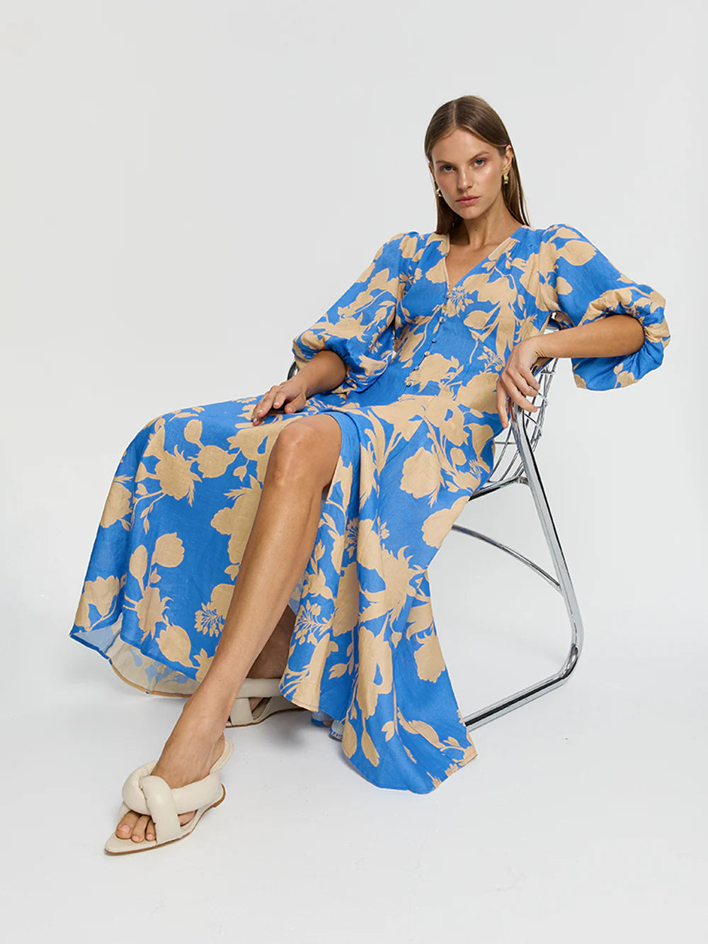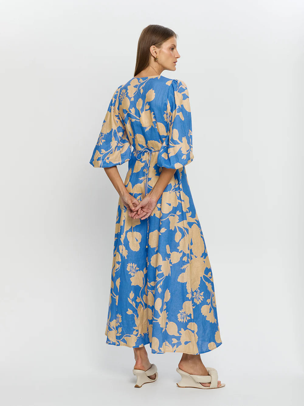 Aurora is a large-scale tan florals on a cobalt blue base. Crafted from 100% Linen, the Aurora Maxi Dress features a v-neckline, button through front, 3/4 sleeves with elasticated cuffs, complete with a waist tie.