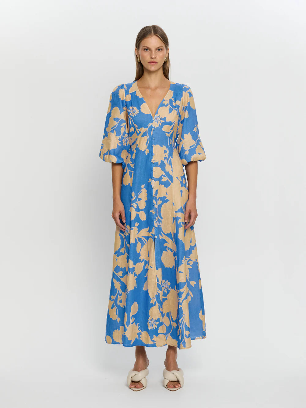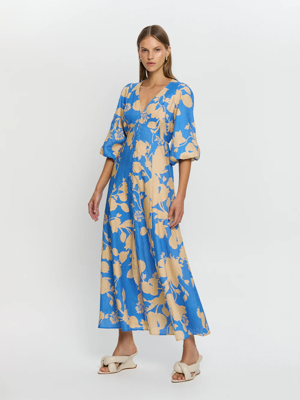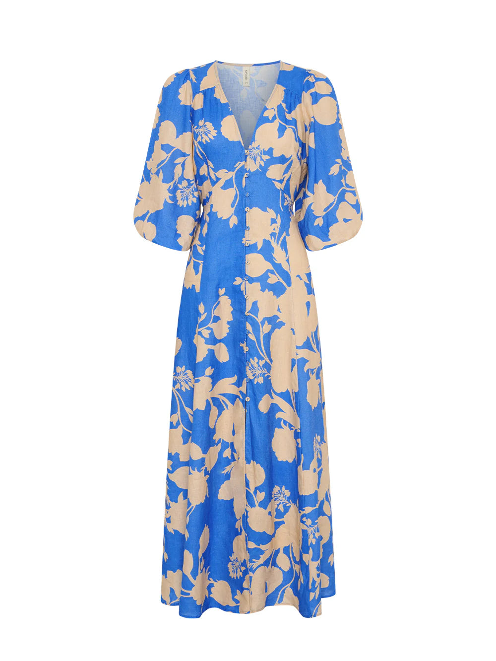 Aurora is a large-scale tan florals on a cobalt blue base. Crafted from 100% Linen, the Aurora Maxi Dress features a v-neckline, button through front, 3/4 sleeves with elasticated cuffs, complete with a waist tie.