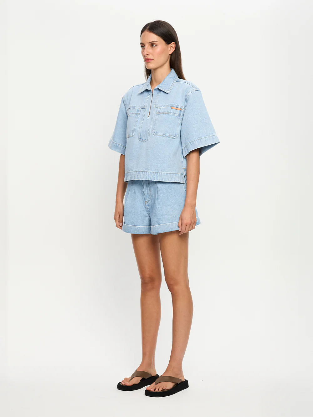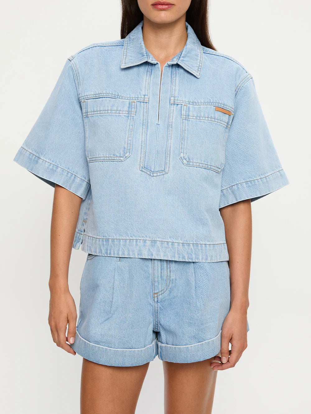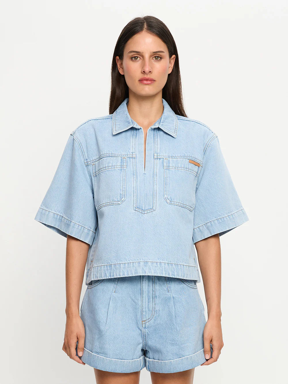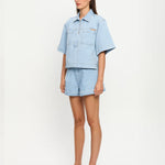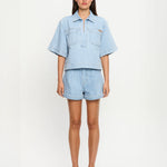 The Avery Top in light blue is a relaxed cropped boxy fit featuring a v neckline, patch pockets complete with signature logo hardware.