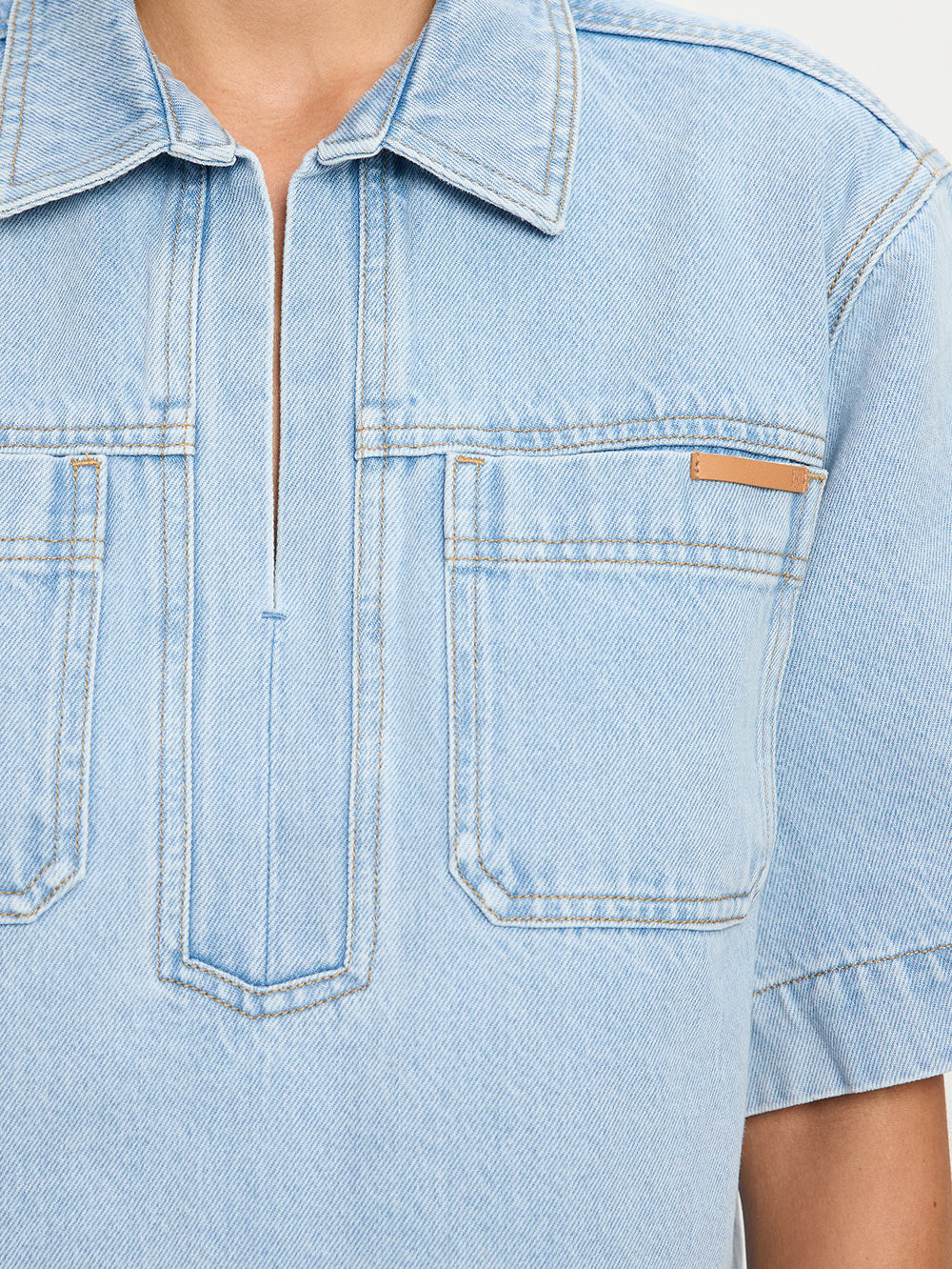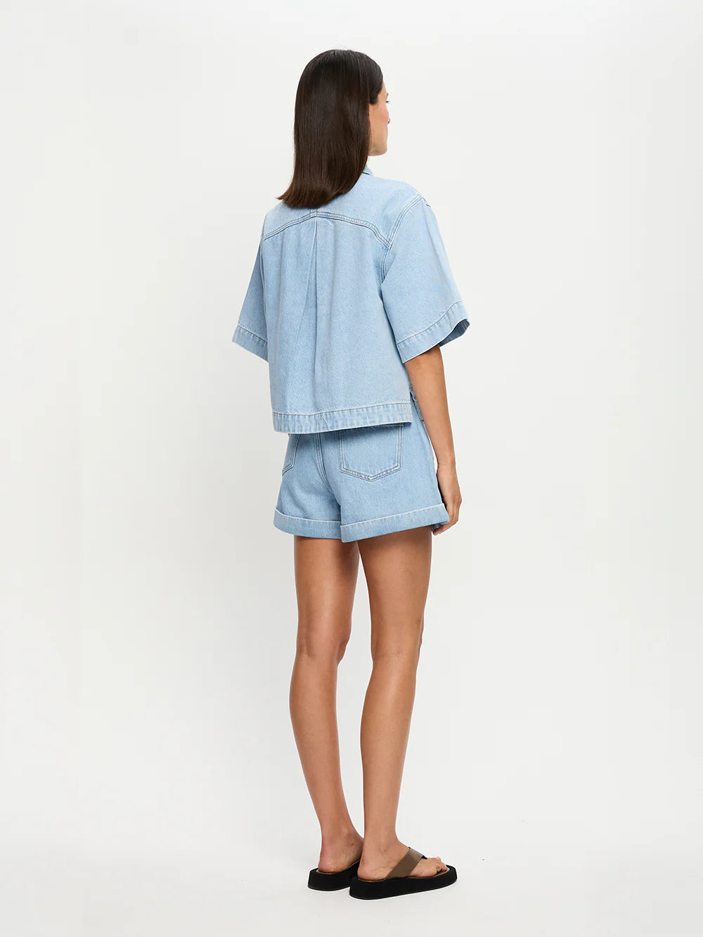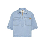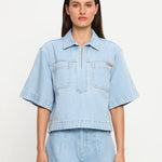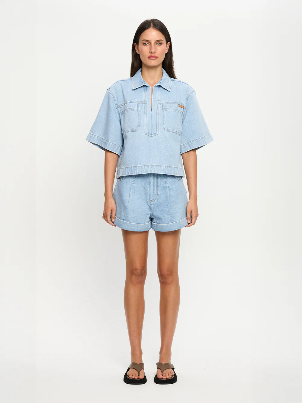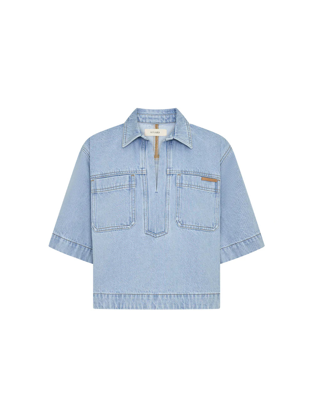 The Avery Top in light blue is a relaxed cropped boxy fit featuring a v neckline, patch pockets complete with signature logo hardware.