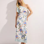 Azure is a bold floral, alive with striking blue blooms, terracotta accents and green leaves on a crisp white base. The Azure Midi Dress silhouette features an asymmetric neckline and adjustable shoulder tie, finished with contrast mint detailing along the neckline and hem. Perfect for long lunches, coastal getaways and elevated evening occasions.