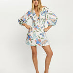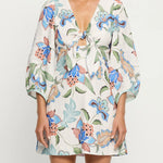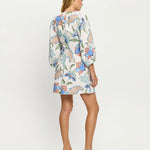 Azure is a bold floral, alive with striking blue blooms, terracotta accents and green leaves on a crisp white base. The Azure Mini Dress is defined by a v-neckline, tie-front bodice and long sleeves, finished with contrast mint detailing that frames the print with subtle distinction. Style with heels for an elevated evening look, or wear with sandals for effortless daywear.