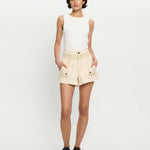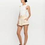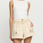 The Celene Denim Short in cream features contrast topstitching and panel detailing, front fold over pockets, complete with antique brass logo hardware.