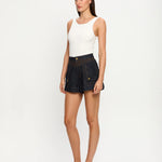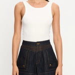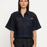 A modern essential, our signature Celene Denim Short in raw indigo features front fold over and back patch pockets, contrast topstitching and panel detailing, complete with antique brass signature hardware.
