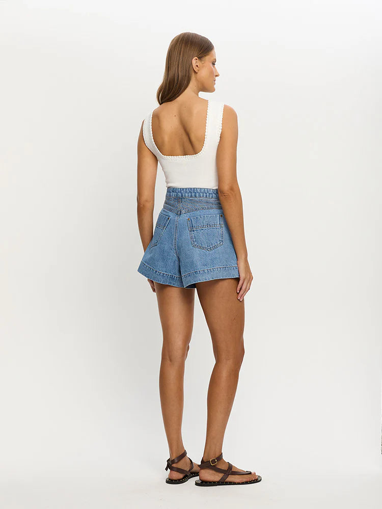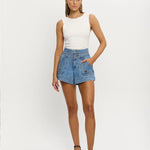 A modern essential, our signature Celene Short in stonewash blue features contrast topstitching and panel detailing, front fold over pockets, complete with antique brass logo hardware.