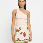 Eden is a vibrant paisley print featuring intricate motifs in red, pink, and green tones set against a light neutral base. The Eden Mini Skirt is an A-line skirt shape framed with a lime green band with contrast stripe across the hem. Style with the matching Eden Shirt for a coordinated look, or pair with our signature tallulah tank and sandals for weekend outings.