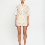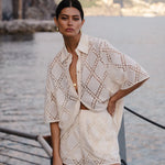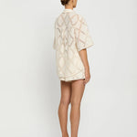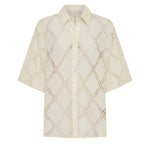 The Izzy Shirt in cream is an oversized fit crafted in a diamond shape design with crochet inserts, classic collar, complete with signature shell buttons.