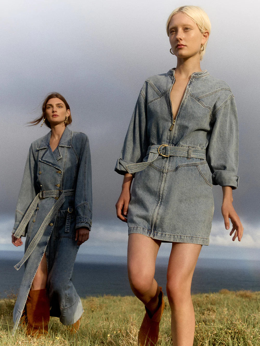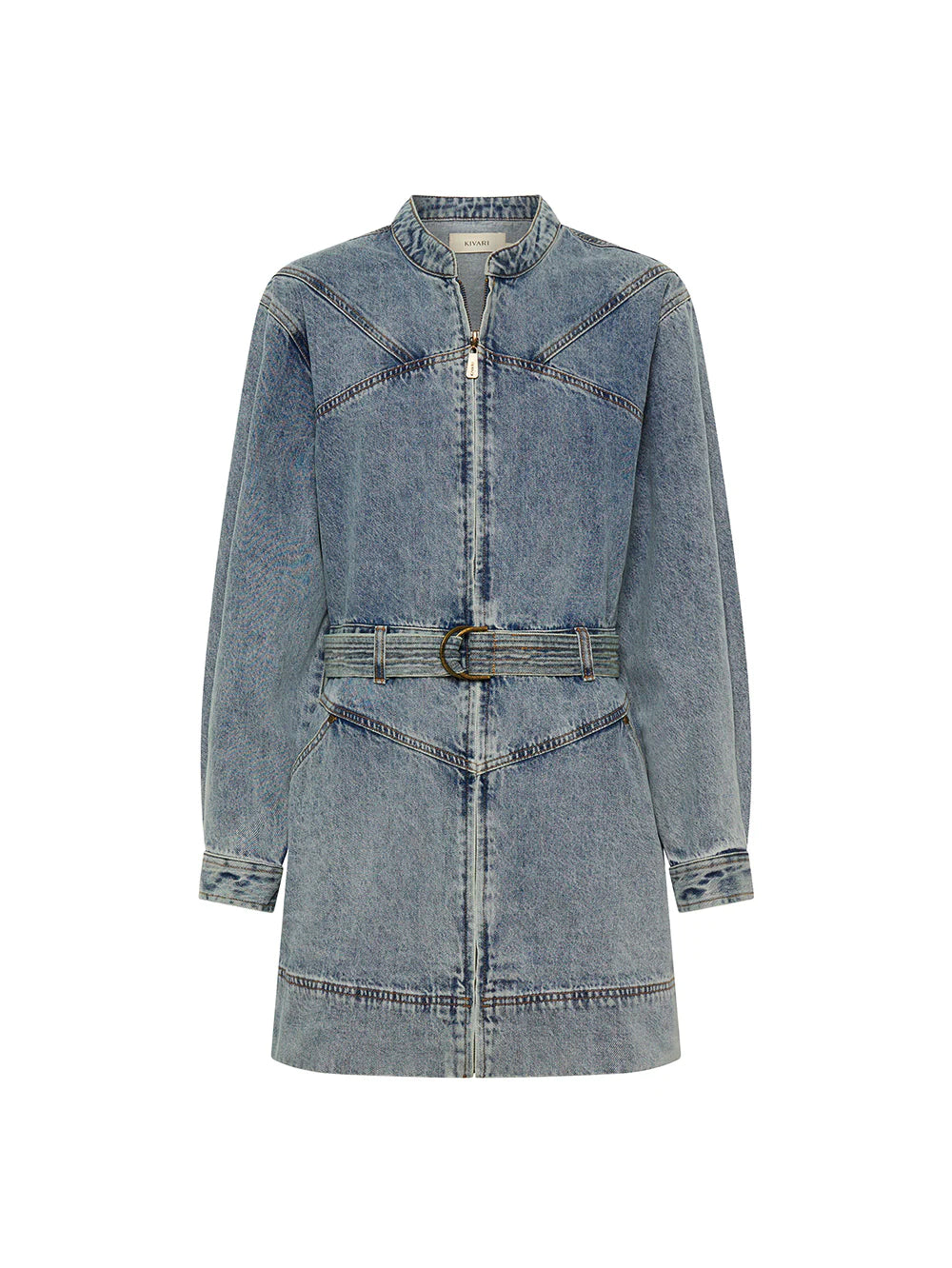 The Jimmy Denim Mini Dress in a light blue acid wash. Featuring a stand collar, open end zip through front, topstitch details throughout, back patch pockets, complete with a signature gold d-ring belt.