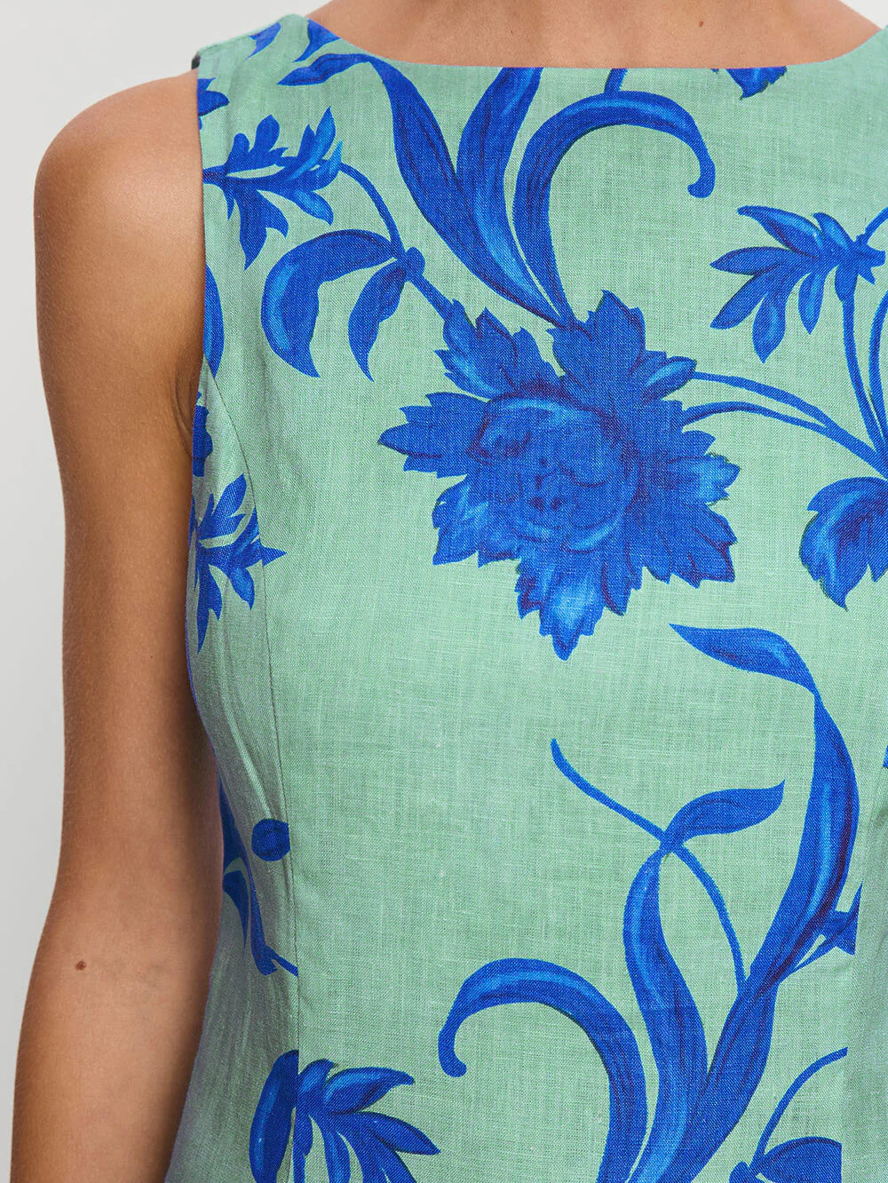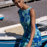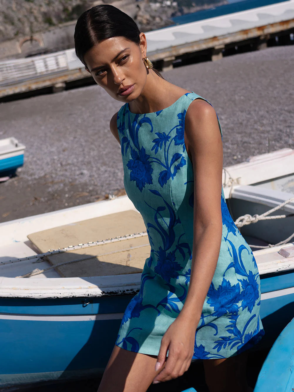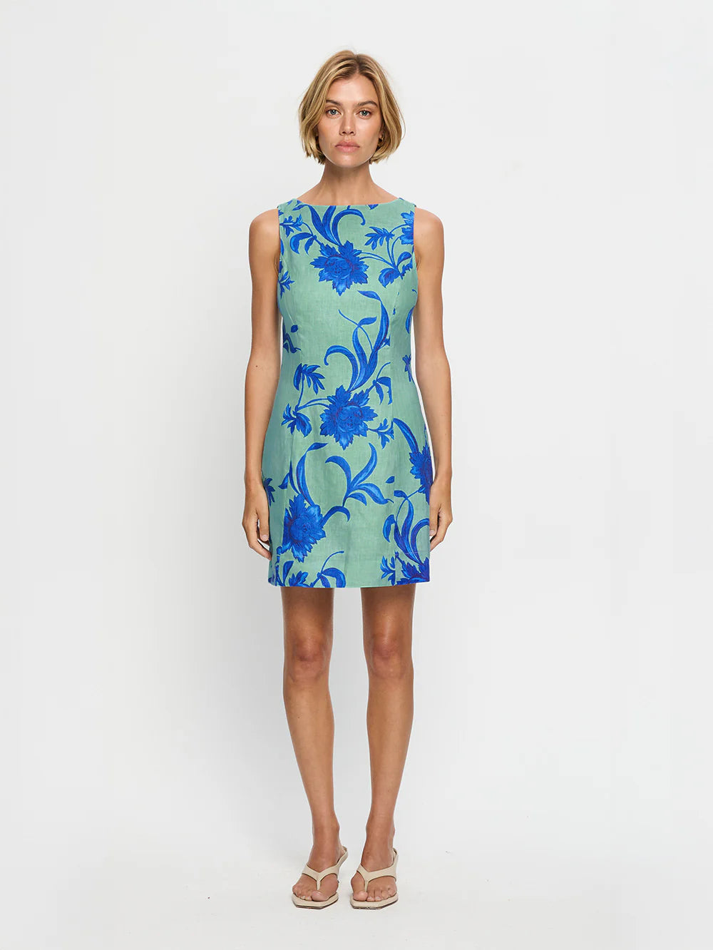 Juniper is bright blue florals set against a light teal base. The Juniper Mini Dress features a high boat neckline at front, a square back neckline and complete with ties at the back neck.