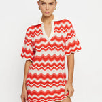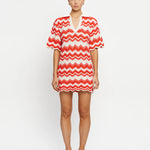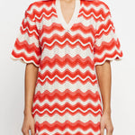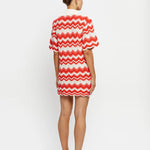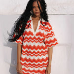 The Leighton Mini Dress in coral is crafted from an intricate wave-knit stitch in a relaxed silhouette, featuring a ribbed collar and scalloped edging at the hem and sleeves. Designed to feel lightweight and effortless, it’s a modern knit made for warm-weather styling. Pair with sandals for relaxed daytime plans and coastal escapes.