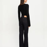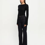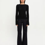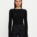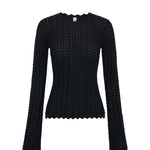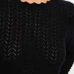 The Logan Knit Top in black is crafted with a pointelle stitch design featuring a high neckline, flared sleeves complete with scallop edge detailing.