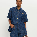 A boxy, oversized silhouette crafted in a printed denim. Our Signature Marla Shirt features a button-through front and signature brass hardware, offering a considered contrast to its relaxed form. Laid-back in shape, elevated in detail the Marla is designed to be worn on repeat, solo or styled as a set.