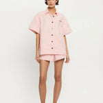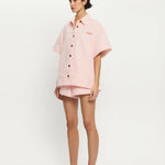 A boxy, oversized silhouette crafted in a pink denim. Our Signature Marla Shirt features a button-through front and signature brass hardware, offering a considered contrast to its relaxed form. Laid-back in shape, elevated in detail the Marla is designed to be worn on repeat, solo or styled as a set.