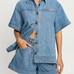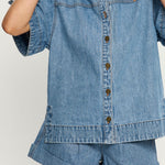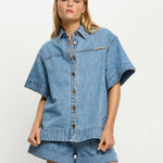 The Marla Denim Shirt is crafted in a soft stonewash blue denim, designed in an oversized, boxy silhouette with short sleeves and a button-through front finished with signature hardware. A timeless piece that balances structure with ease. Wear open with a Tallulah Tank for relaxed weekends, or pair with the Avery Denim Shorts for a modern double-denim look.
