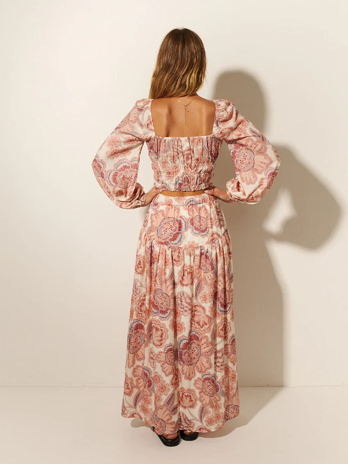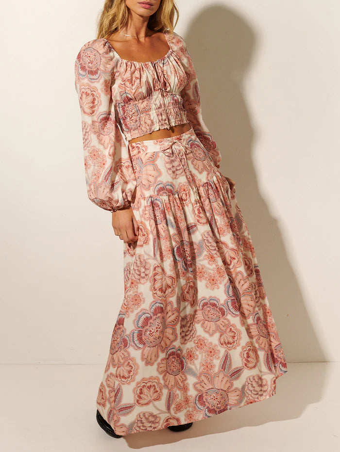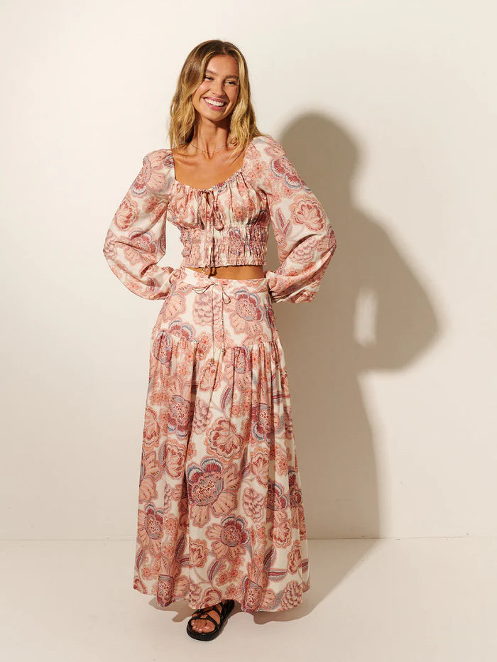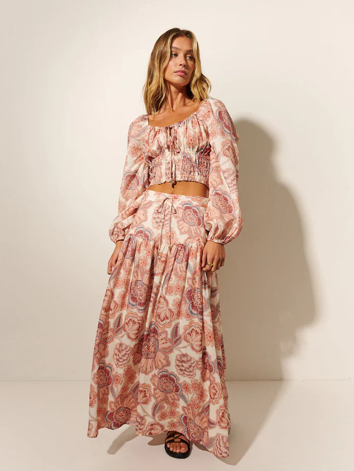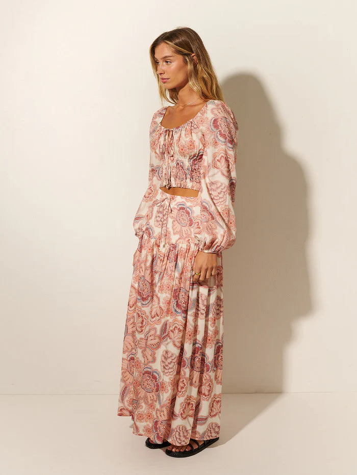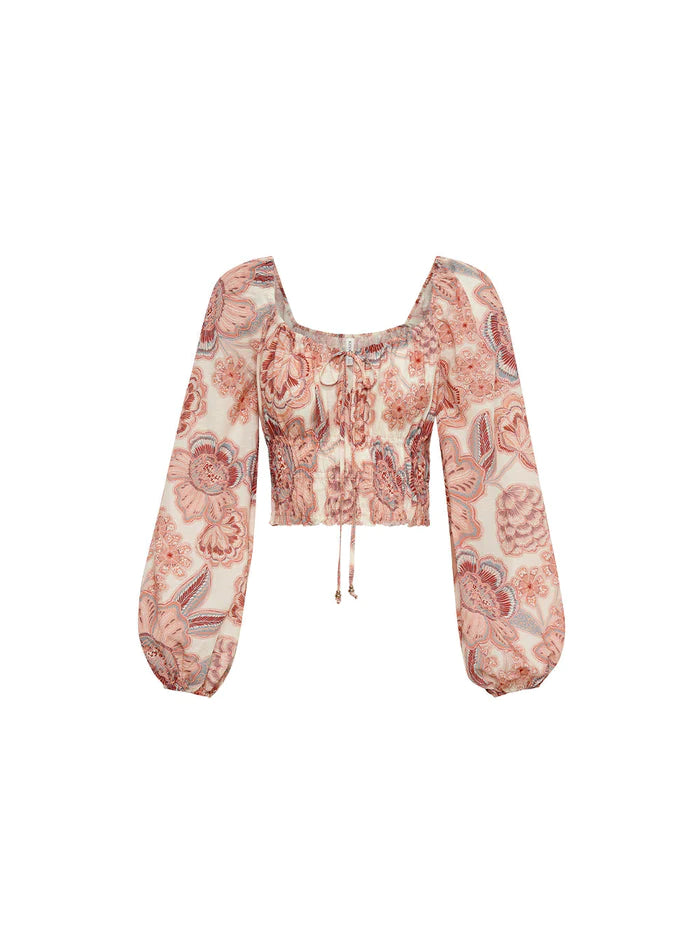 Maya depicts intricate florals in an array of pink and ruby tones on a fresh natural base. The Maya Crop Top features an elasticated neckline, shoulder and waist, drawstring tie neckline, full-length blouson sleeves and shirred bodice details.