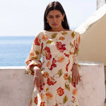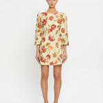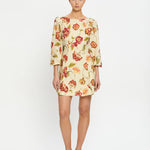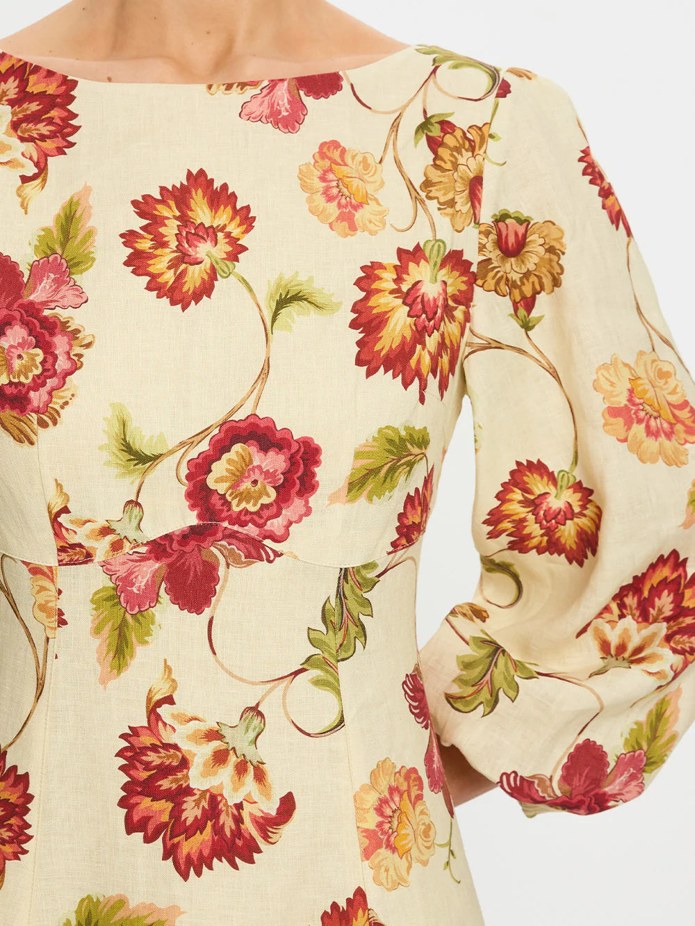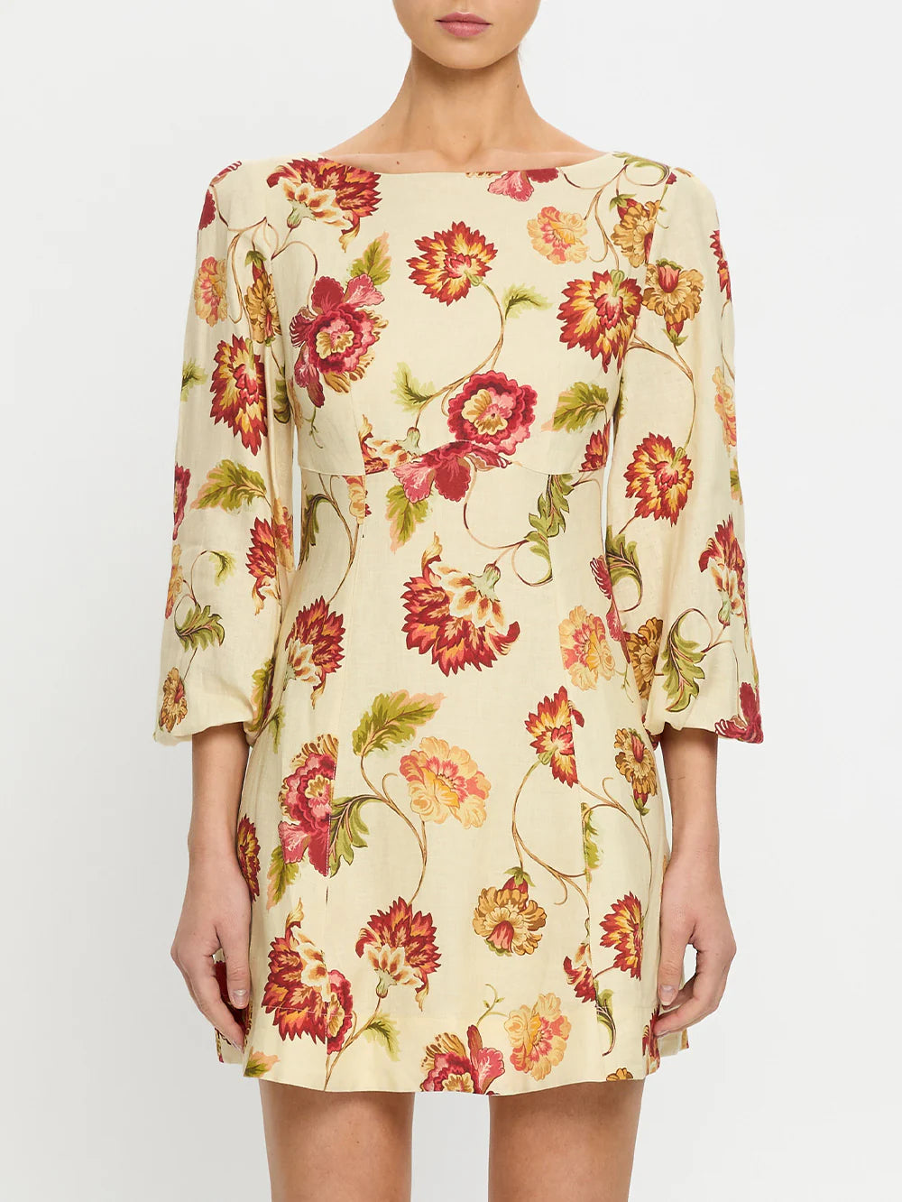 Odessa is warm red and orange vine florals on a soft yellow base. The Odessa Sleeved Mini Dress is crafted in 100% linen with a slightly flared shape featuring a boat neckline, under bust detailing, and blouson sleeves complete with elasticated cuffs.