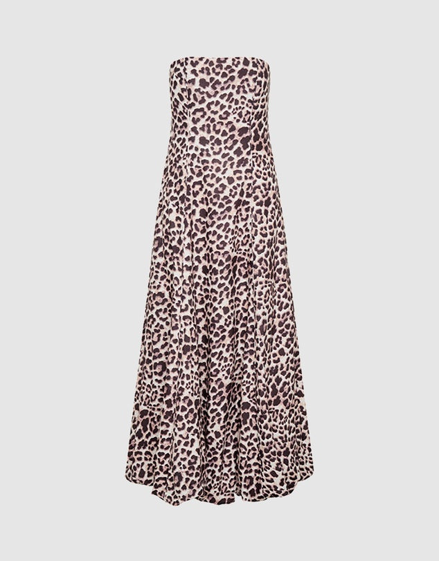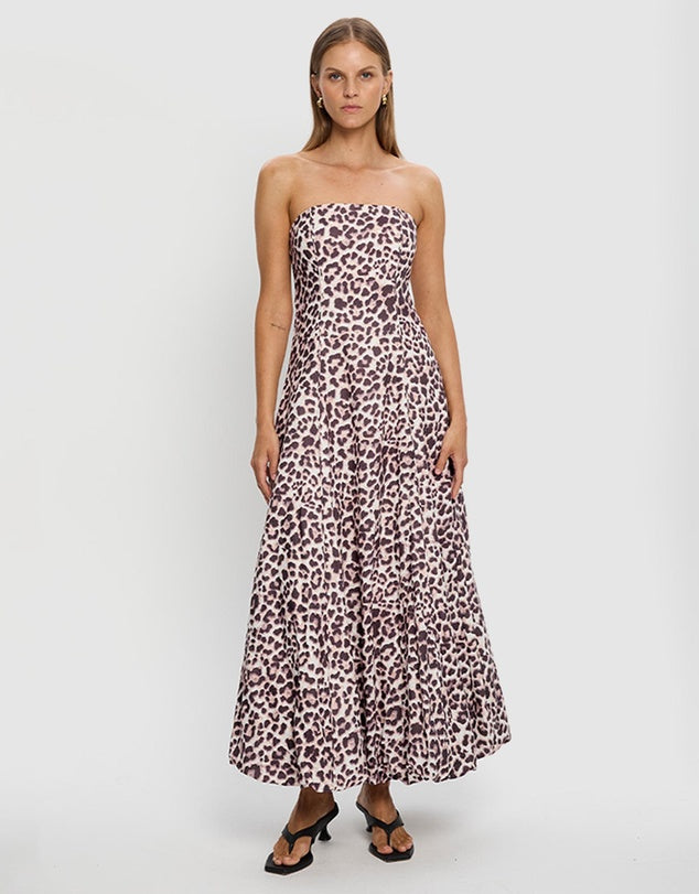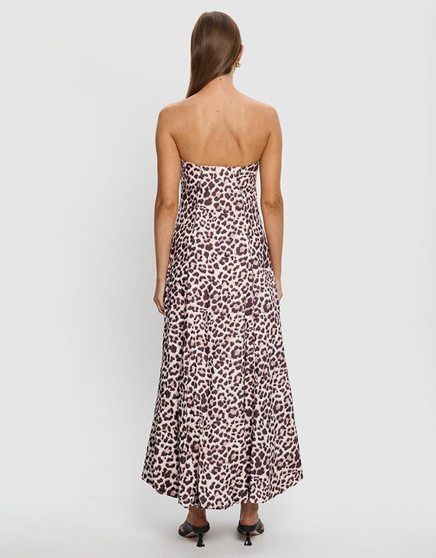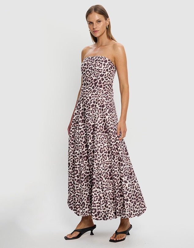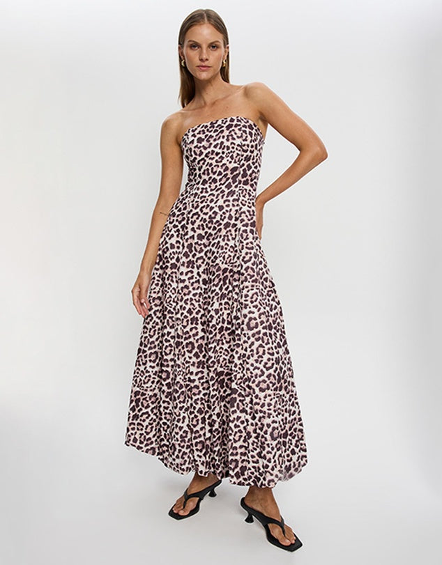 Reese is a timeless leopard print with neutral brown hues on a soft ivory base. The Reese Maxi Dress features a strapless neckline, flared skirt, bubble hem complete with piping details throughout.
