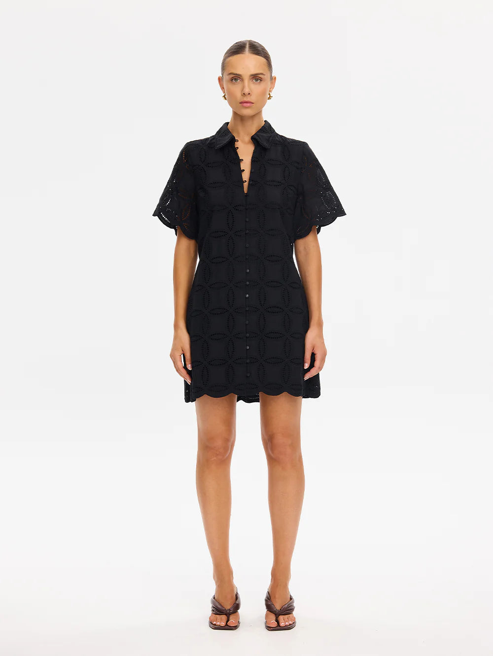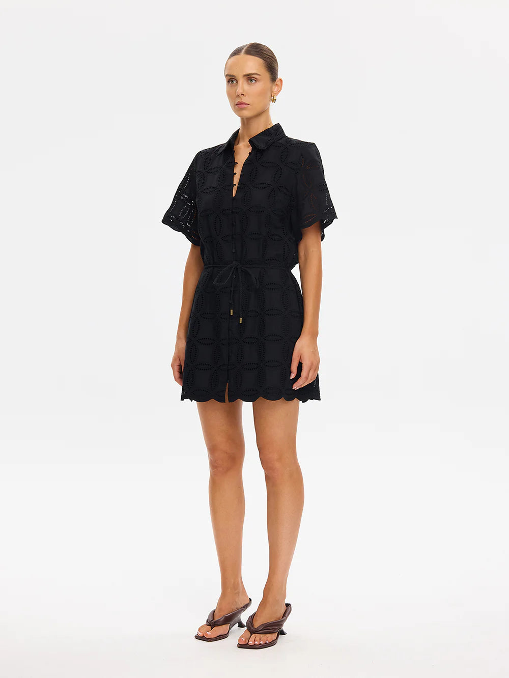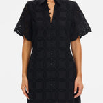 The Rio Shirt Dress in black is crafted from 100% cotton broderie, featuring a classic collar and button-through front, finished with scalloped edging along the sleeves. Designed in a relaxed silhouette, it balances ease with intricate detailing for a timeless look. Perfect for long lunches, coastal getaways or relaxed daytime occasions.