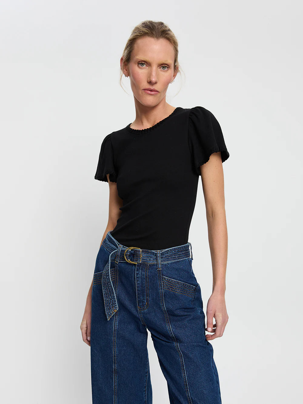 The Tallulah Tee is designed in a fitted rib knit, featuring a high neckline and flutter sleeves with soft crochet edge detail in a black hue.