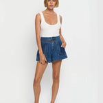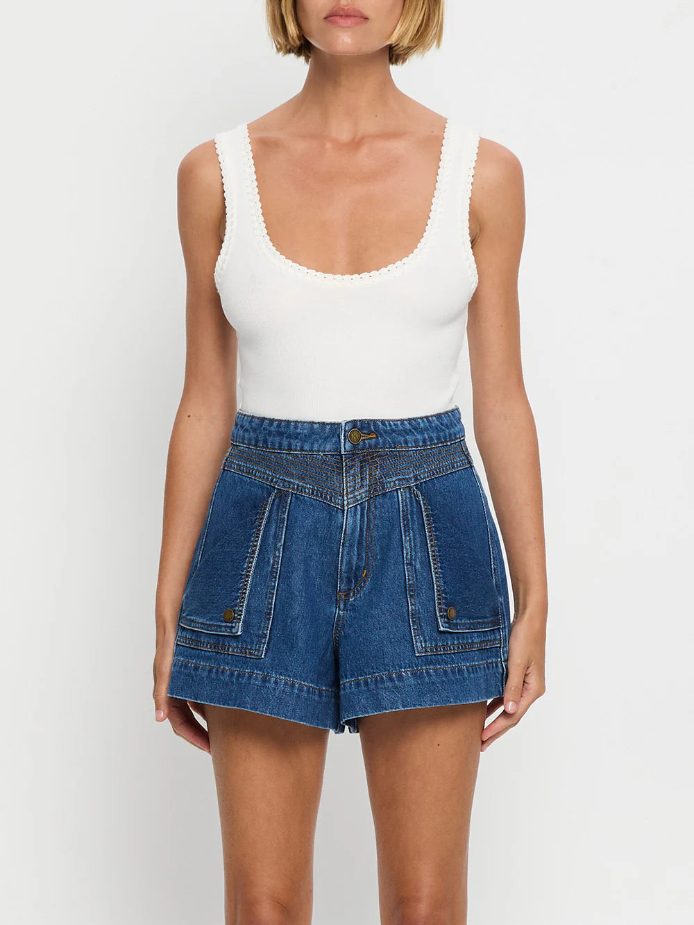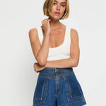 A modern essential, our signature Tallulah Scoop Tank in white is a reversible style designed in a fitted rib knit, featuring a scoop neckline with soft crochet edge detail.