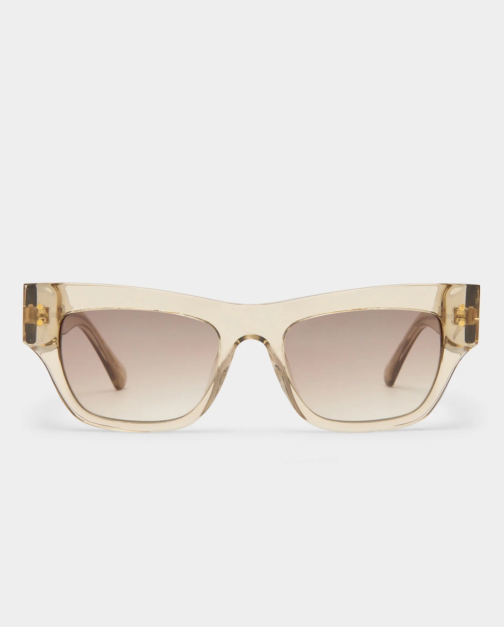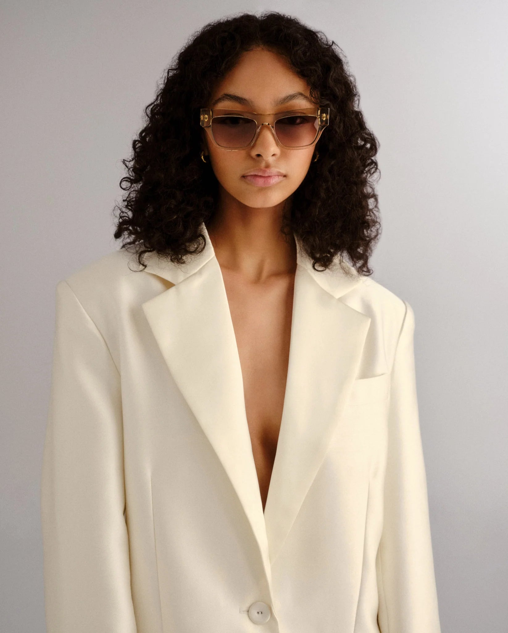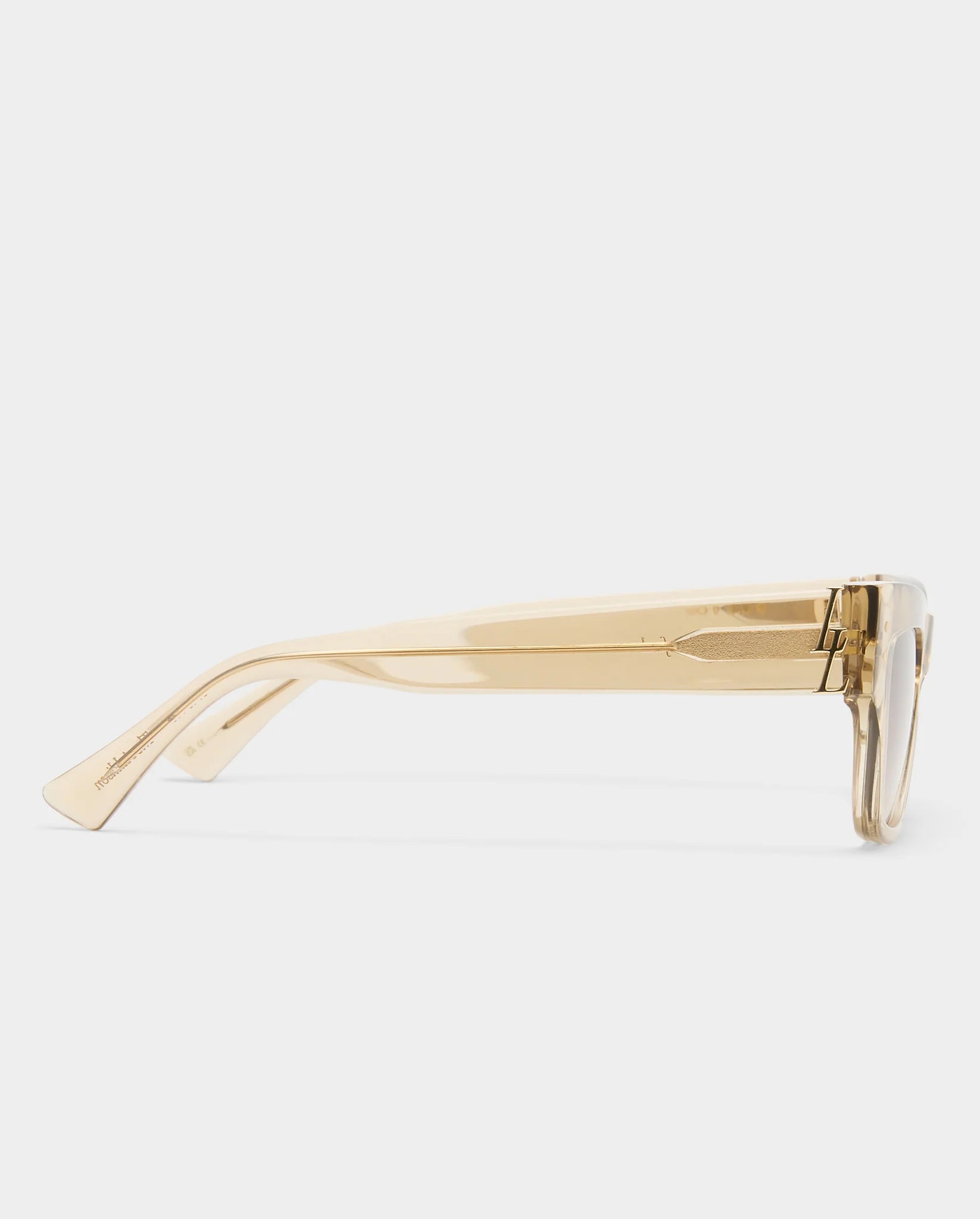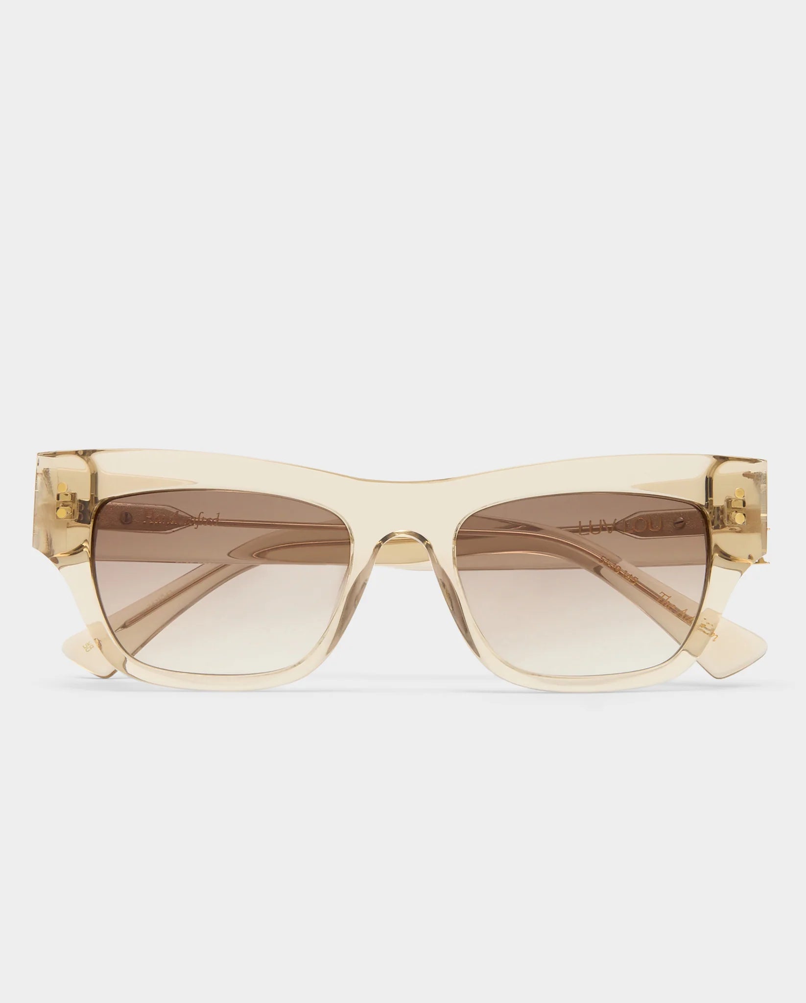 The Addison is a classic elevated wayfarer shape, which is effortless and chic in its design. Handcrafted with premium crystal latte acetate and a brown gradient lens. This style features a thick temple arm with signature gold initial detailing enhancing its luxe finish.