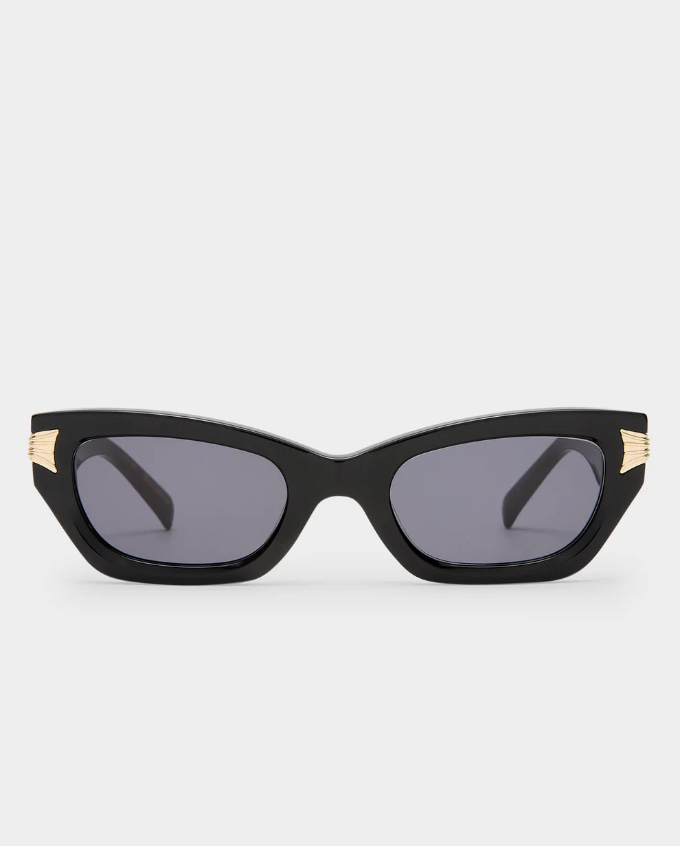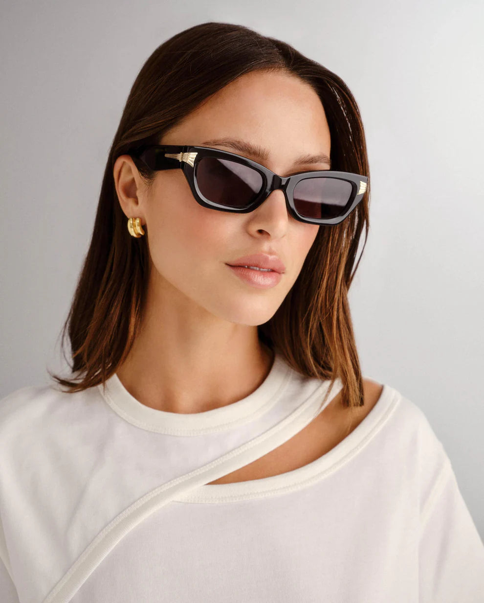 The Cameron is a luxurious rectangle cat eye frame, designed using thick acetate and embellished with premium gold scalloped detailing which wraps around the temple. Featuring premium black bio-acetate and a smoke mono lens, this handcrafted frame is bringing effortlessly chic to any fit.