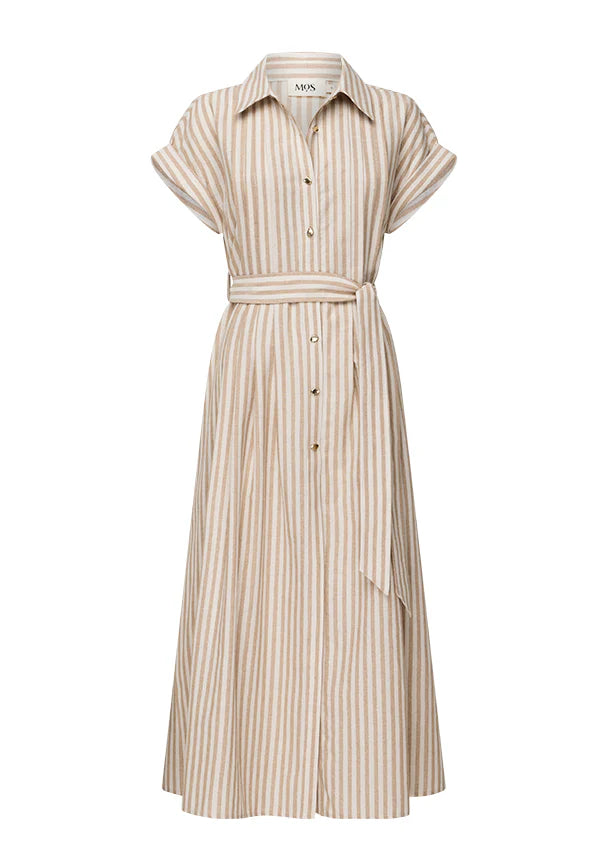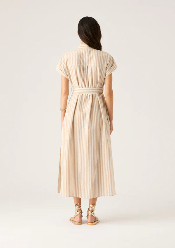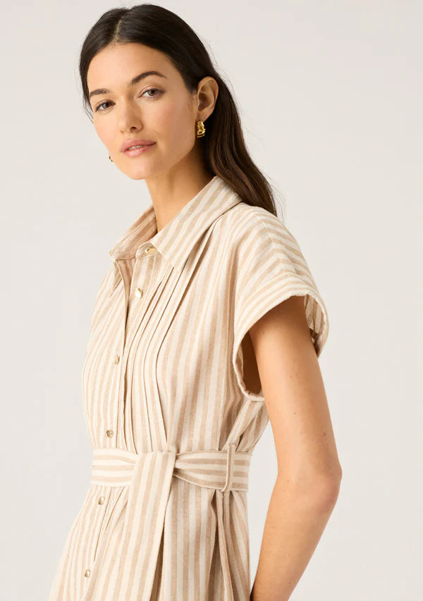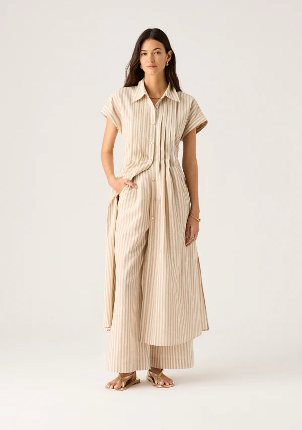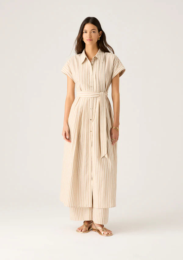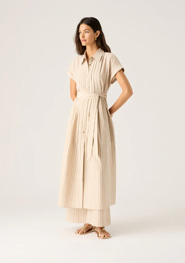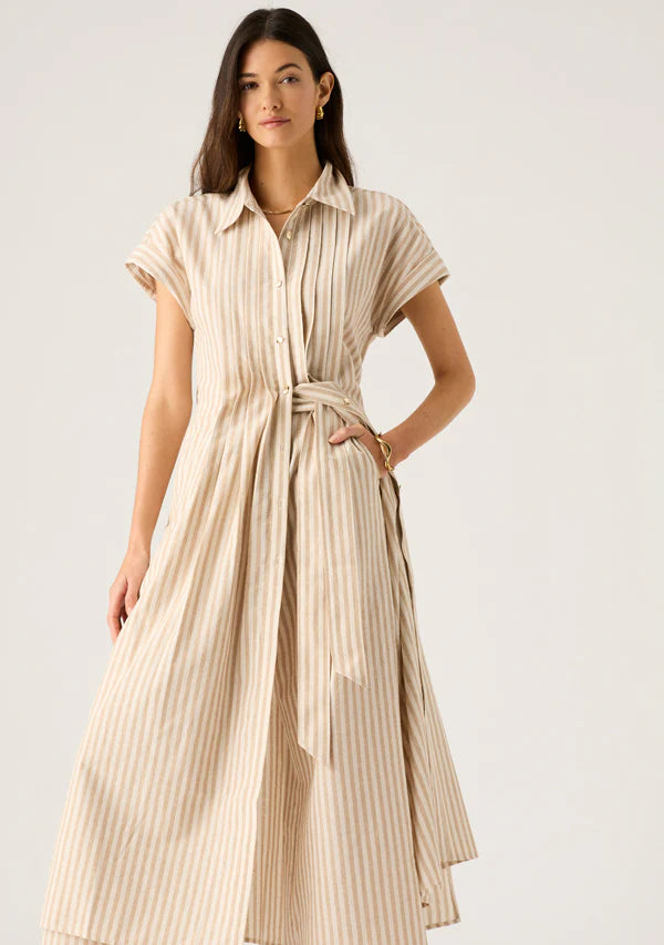Using a lightweight cotton blend to enhance sleeveless summer shaping, this dress skims close through to the hip, where soft gathers create volume as it sways to midi length. Revealing sable and ivory within a smart vertical stripe, the dress accentuates its fit with neat pleating through the bodice, where a concealed gold button fastening and self-tie fabric belt complete the look.